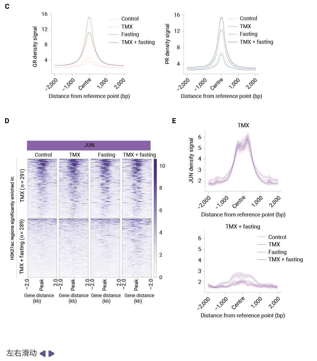 图 3. 禁食增强 GR 和 PR 染色质结合并降低 JUN 位点的增强子活性[3]。