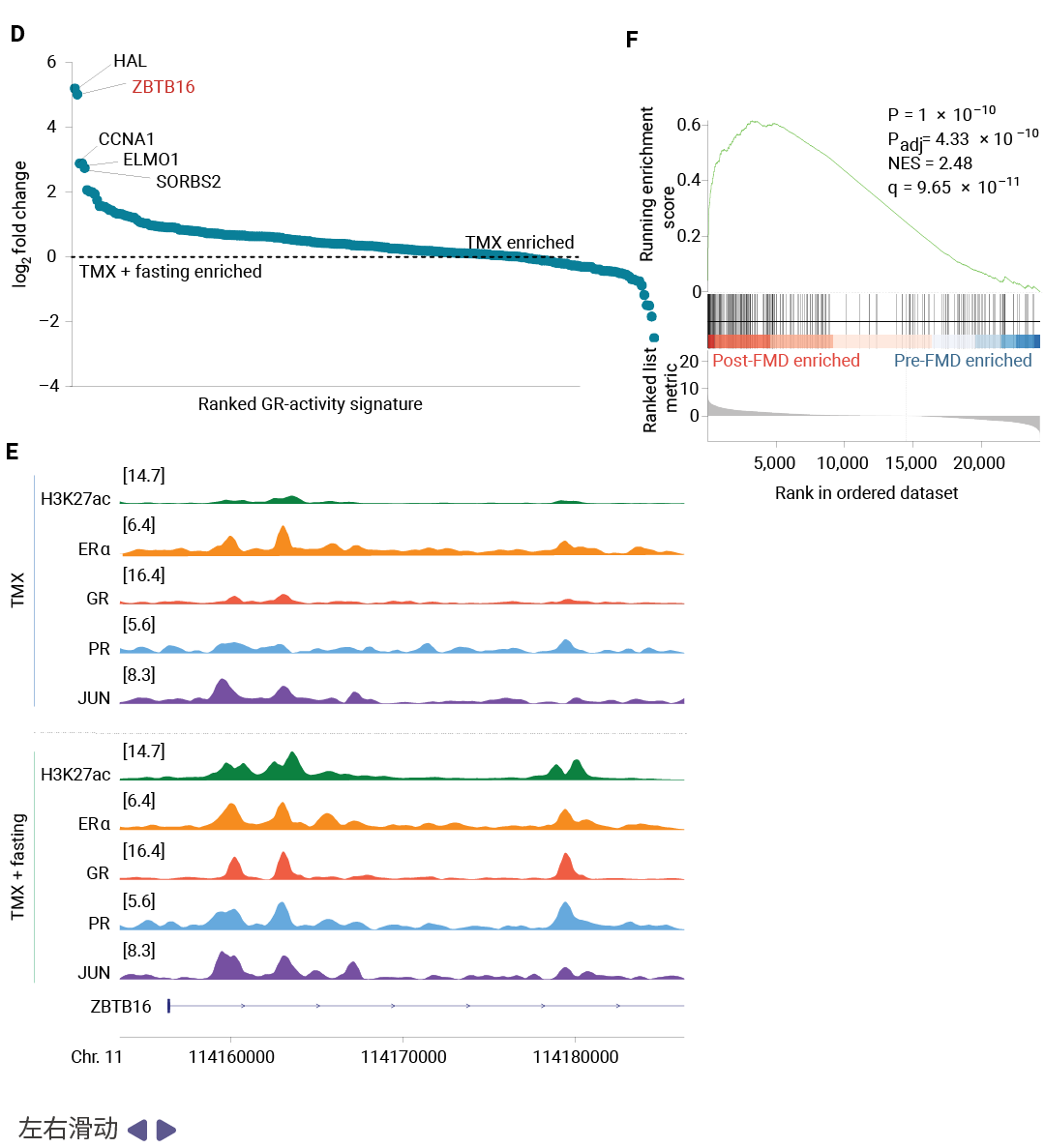 GR 激活的转录程序与抗肿瘤效应是第二个关键发现。RNA-seq 分析显示,禁食联合 TMX 显著抑制了 MYC 靶基因和 E2F 靶基因等增殖相关通路,同时 mTOR 信号活性降低。研究团队利用泛癌适用的 GR 活性基因特征 (GR-activity signature) 分析发现,TMX 单独治疗实际上降低了 GR 转录活性,而禁食联合 TMX 则显著激活了 GR 驱动的基因表达程序。值得注意的是,转录抑制因子 ZBTB16 (又称 PLZF) 是禁食诱导上调的第二高表达基因,该基因已被报道介导 GR 的抗肿瘤效应。