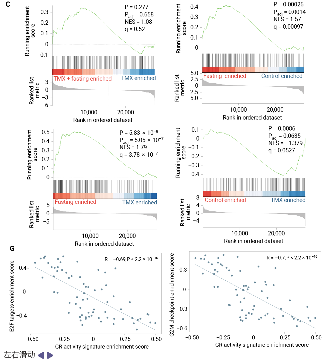 研究团队分析了两项临床试验的患者数据:NCT05748704 试验中,接受 FMD 联合内分泌治疗的乳腺癌患者血清皮质醇和孕激素水平显著升高;NCT03454282 (DigesT 研究) 的肿瘤样本 RNA-seq 分析显示,FMD 后 GR 活性特征评分显著升高,且与 E2F 靶点和 G2M 检查点等增殖标志物呈负相关。这些临床数据与动物模型发现高度一致,证实了 GR 激活在人体内的相关性。