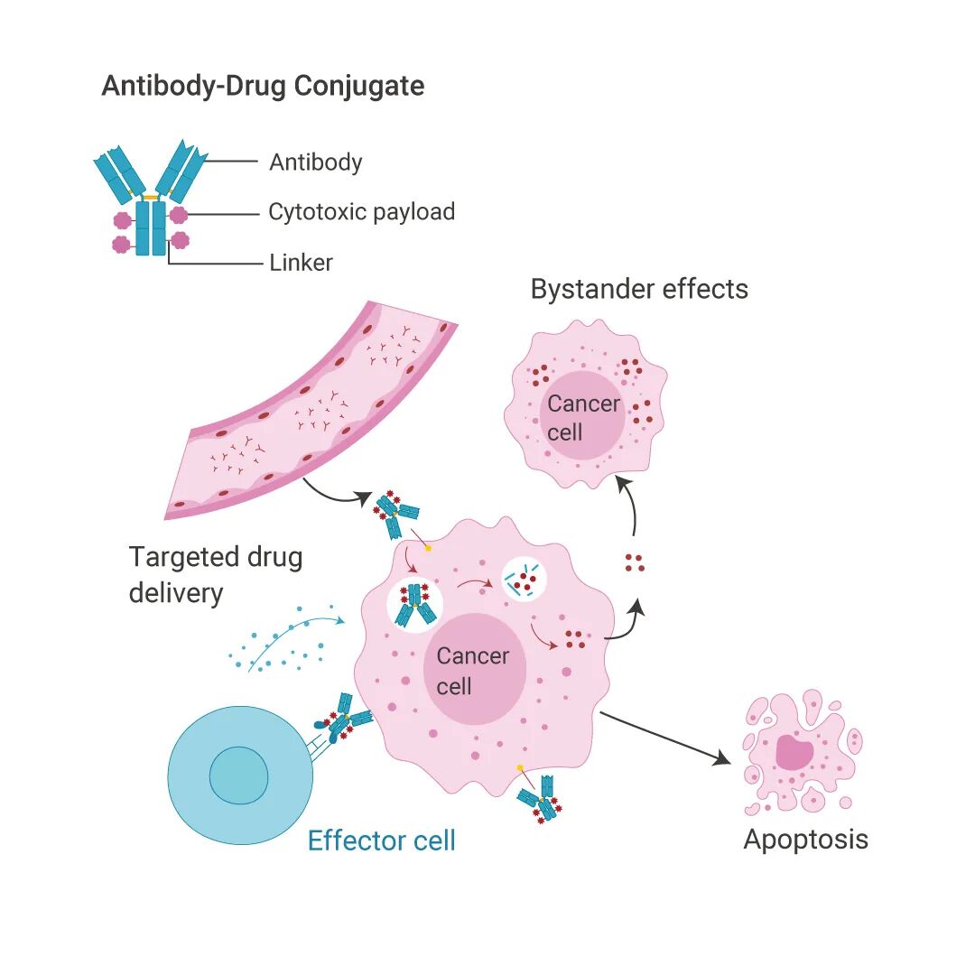 RDC药物的核心逻辑的是“精准投递、定向杀伤”,其结构由四大关键部分组成:介导靶向定位的载体(抗体、多肽或小分子)、连接臂、螯合物和放射性同位素,四者协同作用,实现对肿瘤细胞的精准打击而不损伤正常组织。与传统化疗的“地毯式轰炸”不同,RDC药物的靶向载体如同“GPS导航”,能精准识别肿瘤细胞表面的特异性靶点,将具有杀伤作用的放射性核素精准递送至肿瘤部位,再通过核素衰变释放的α射线、β射线或俄歇电子,利用电离辐射破坏肿瘤细胞DNA结构,从而抑制或杀死病变细胞,实现治疗目的。