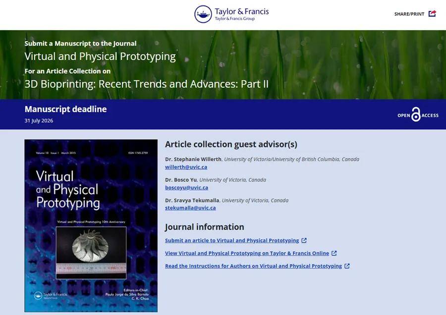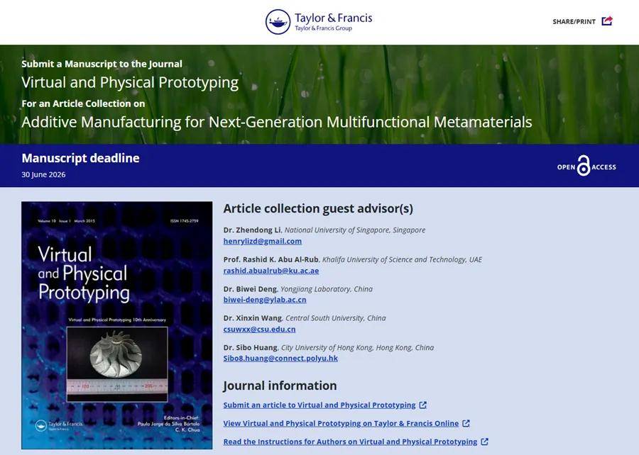 Virtual and Physical Prototyping作为虚拟与快速原型领域的旗舰期刊,致力于为全球学者与行业专家搭建高水平的国际交流平台,推动创新理念的分享与前沿知识的传播,全面涵盖虚拟原型、快速成型及相关跨学科领域的理论探索与实践应用。目前,本刊正围绕包括增材制造、多功能超材料、可持续制造、3D生物打印、组织工程、机器学习在内的多个前沿主题征稿。