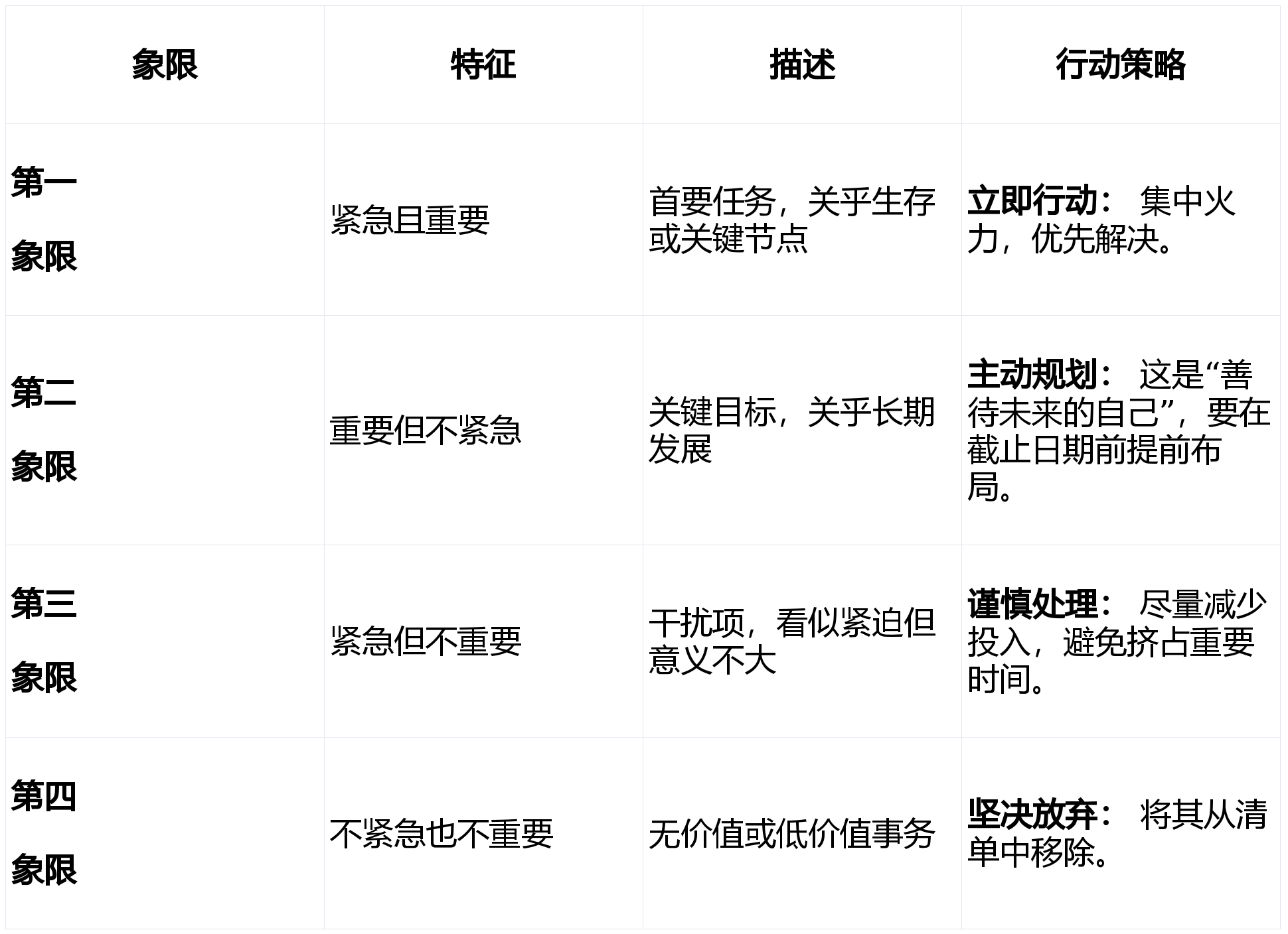 这个模型通过“紧急”和“重要”两个维度,将任务分为四个象限,帮您理清思路。