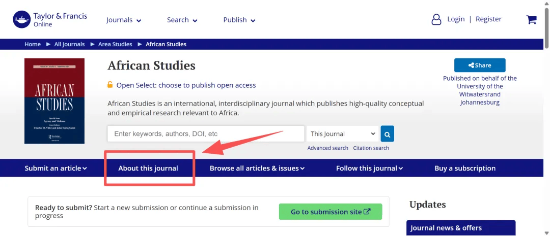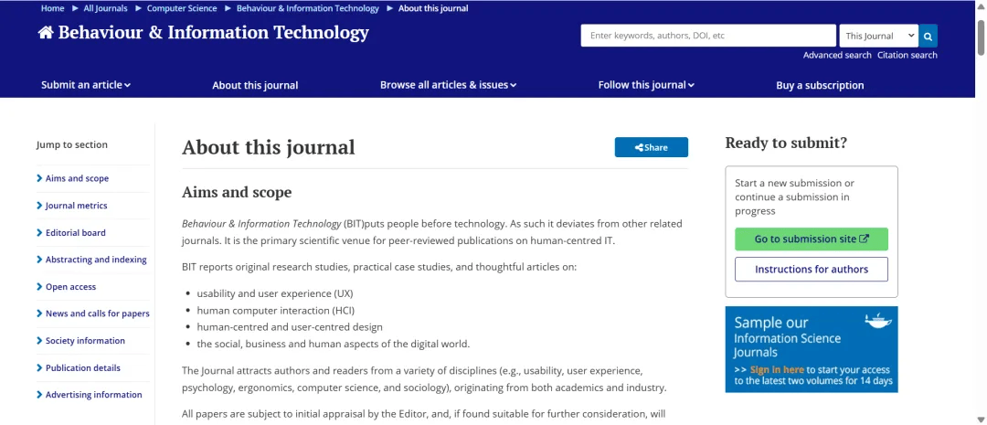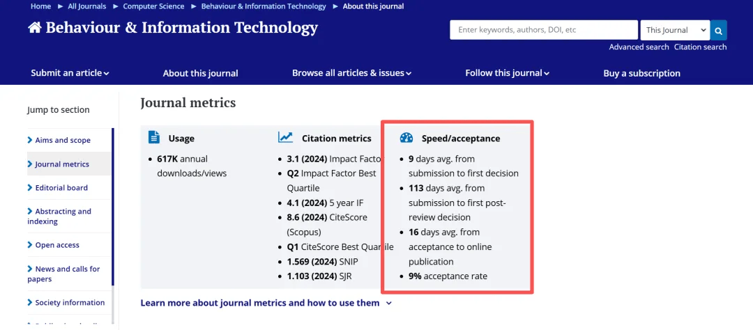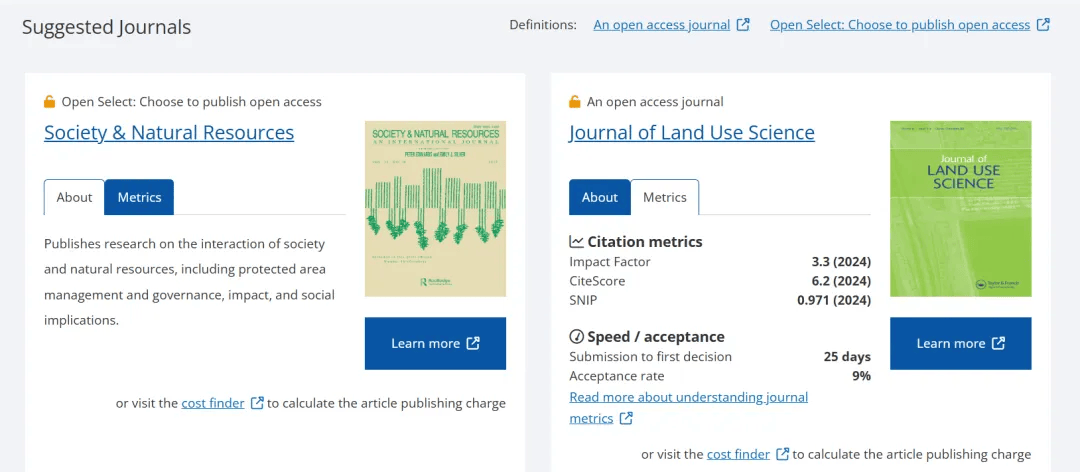 善用Taylor & Francis的“Journal Suggester”选刊工具,上传研究摘要或关键词后,系统会基于内容分析推荐适配期刊,帮您快速锁定候选名单。同时建议翻阅期刊近1-2年发表的论文,观察其研究风格、方法论是否与您的论文匹配,进一步验证适配度。您可以直接查看期刊简介、期刊数据指标以及稿件处理平均时间,并可以一键直达期刊主页。