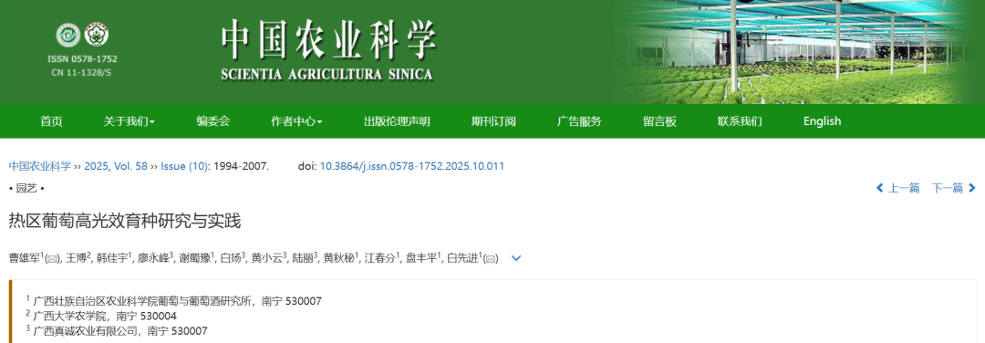 近期,广西壮族自治区农业科学院葡萄与葡萄酒研究所白先进课题组完成的题为“热区葡萄高光效育种研究与实践”的研究在《中国农业科学》2025年第58卷10期正式发表。