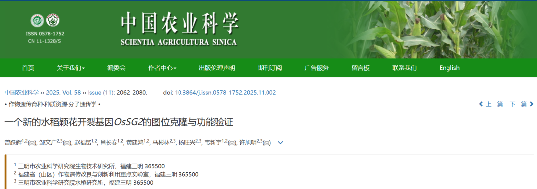 近期,三明市农业科学研究院生物技术研究所韦新宇课题组完成的题为“一个新的水稻颖花开裂基因OsSG2的图位克隆与功能验证”的研究在《中国农业科学》2025年第58卷11期正式发表。