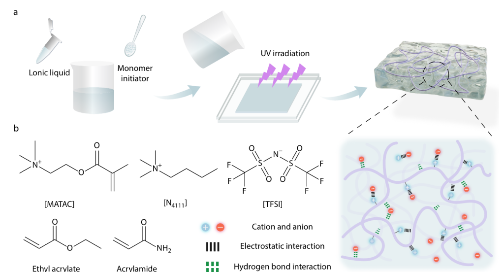 基于上述背景,南京大学物理学院曹毅教授课题组采用简便的“一锅法”,将单体组分,离子液体组分和光引发剂混合均匀后,直接紫外固化即得到多功能性离子凝胶。离子凝胶的聚合物网络由丙烯酸乙酯(EA),丙烯酰胺(AM)和甲基丙烯酰氧乙基三甲基铵构成,并且额外引入了少量的[N4111][TFSI]离子液体作为增塑剂来提高离子凝胶的延展性和能量耗散效果。胺基官能团作为氢键供体,能和与高分子链中的各个分子形成氢键相互作用,增强了离子凝胶的强度和韧性。高分子链上的甲基丙烯酰氧乙基三甲基铵([MATAC])由其对应的离子液体聚合而来,带正电的季铵侧链可以与AM中羰基偶极部分形成离子-偶极相互作用实现对离子凝胶力学性能的进一步提升。额外引入的 [N4111][TFSI]离子液体能和聚合物的弹性网络有着很好的离子-偶极相互作用和氢键相互作用,保证自身不会因离子凝胶受力产生的大形变而泄露(图1)。
