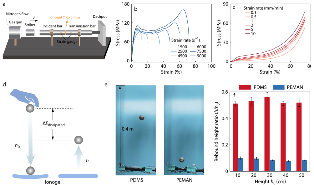 图4 离子凝胶的抗冲击性能表征。(a)SPHB测试系统示意图;(b)不同应变率下离子凝胶的压缩应力-应变曲线;(c)不同应变率下离子凝胶的准静态压缩测试;(d)以PDMS弹性体和(e)离子凝胶作为缓冲层时钢球回弹高度对比示意图;(f)不同跌落高度下球的回弹情况。