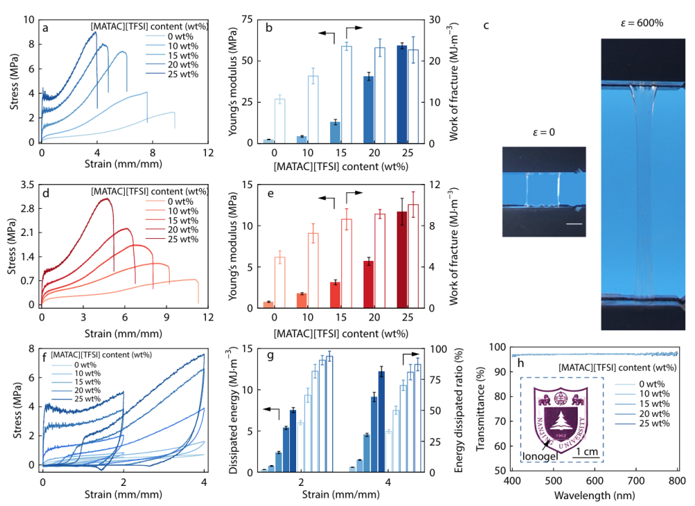 图2 多功能性离子凝胶的力学和光学特性。AM提供氢键的离子凝胶的(a)应力-应变曲线,(b)杨氏模量和断裂功;(c)拉伸前后的离子凝胶照片(比例尺:2 mm);甲基丙烯酰胺(MAM)提供氢键的离子凝胶的(d)应力-应变曲线;(e)杨氏模量和断裂功;AM提供氢键的离子凝胶的(f)应力加载-卸载曲线、(g)能量耗散和能量耗散比和(h)可见光透过率。