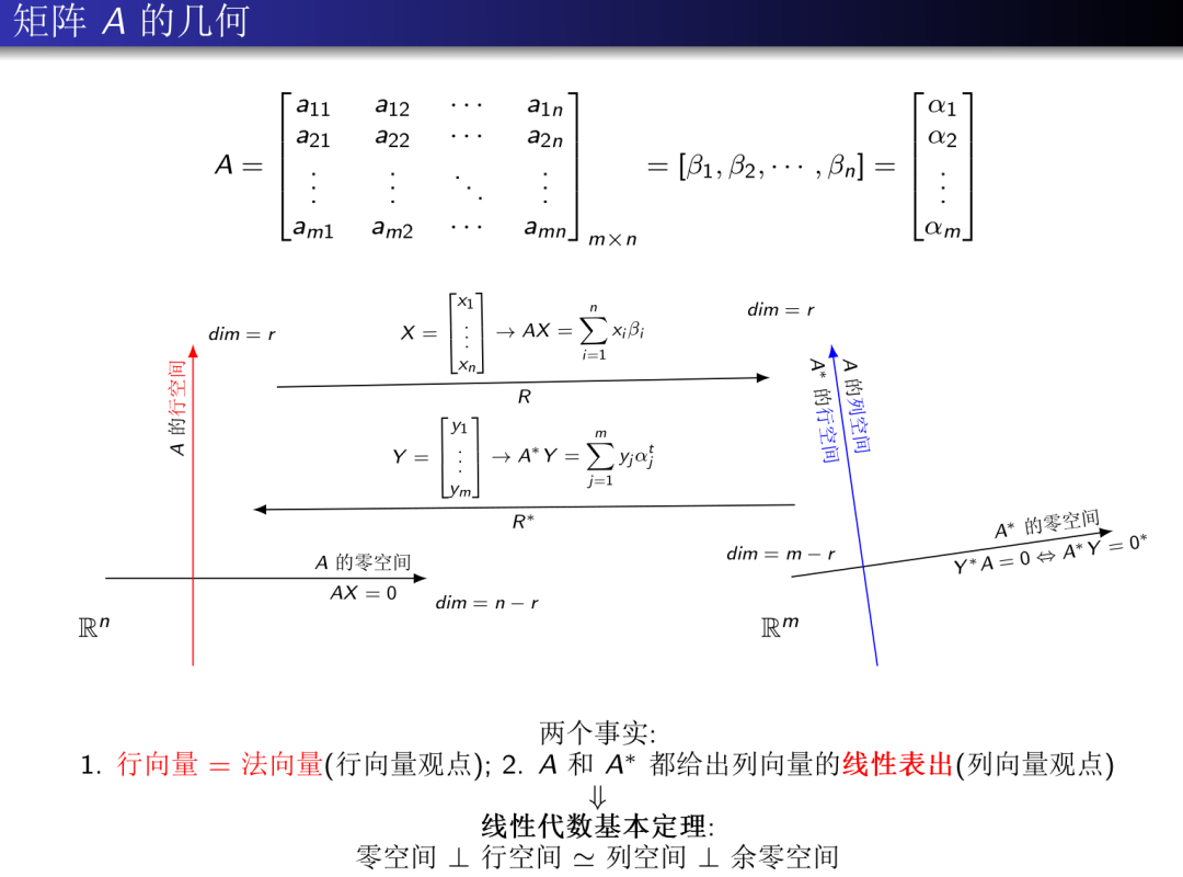 显然, AX 是 A 的列向量的线性组合. A*Y 是 A* 的列向量的线性组合, 因此也是 A 的行向量的线性组合. 因此, R 和 R* 的源空间和靶空间是互换的.