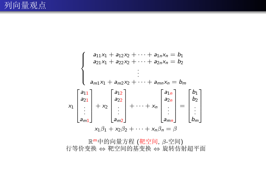 列向量的观点, 也称为靶空间的观点, 它把列向量看作靶空间中的向量, 线性方程组看作是方程右侧的非齐次向量被列向量线性表出的问题, 这也是很自然的观点. 当X取遍源空间中所有的向量, 所有的右侧非齐次向量就张成一个线性空间, 称为矩阵 A 的列向量空间. 接下来我们就会看到, 列向量空间的观点特别适合从几何角度理解高斯消元法.