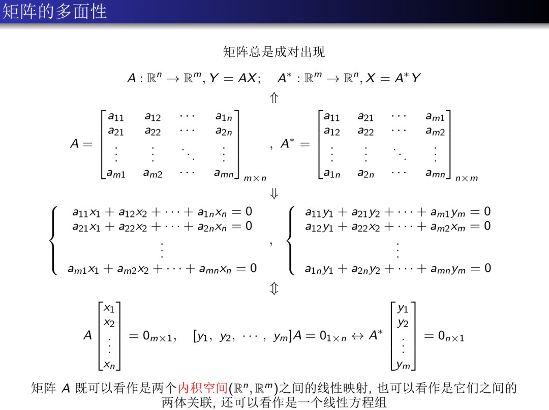 从不同的角度看矩阵很关键. 矩阵可以看作是欧式空间之间的一个线性映射, 也可以看作是一个两体关联. 但是要看到一个矩阵背后的几何, 即Strang教授的四个基本子空间的关系, 我们需要退回到线性方程组的角度来理解矩阵.但是不管怎么看, 一个重要的事实就是矩阵总是成对的出现(每一个矩阵都有唯一的一个转置矩阵). 这个事实虽然看起来很平凡, 但它其实是线性代数范畴非常重要的一种性质, 这个性质就像逻辑中的排中律一样重要. 在经典逻辑中, 命题总是成对出现的(每一个命题都有唯一的一个否命题). 矩阵的成对出现和命题的成对出现, 在范畴学的角度看来是一样的结构.