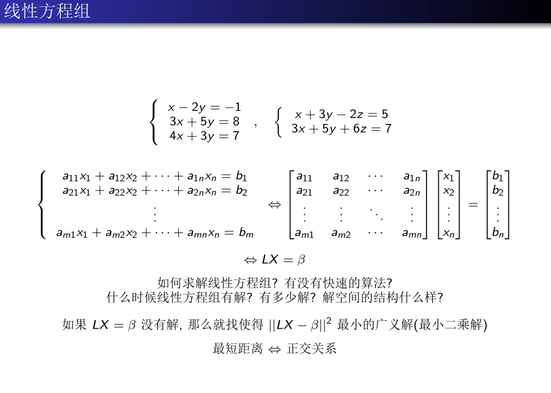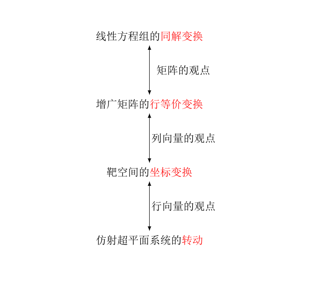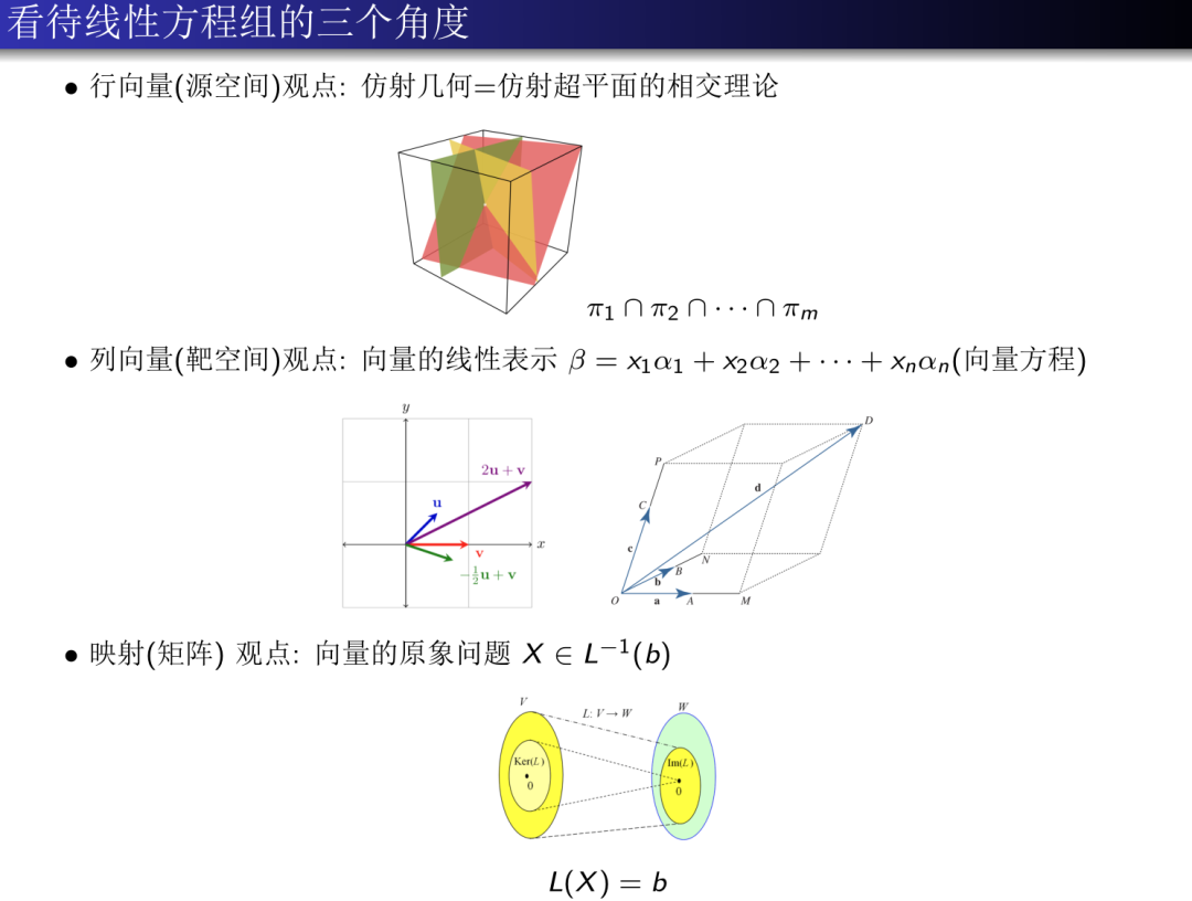 但是, 现在我们关心的是怎么样从不同的角度理解由矩阵 A 定义的线性方程组. 我们给出三种角度的理解, 它们分别是行向量的观点, 列向量的观点以及映射或矩阵的观点.
