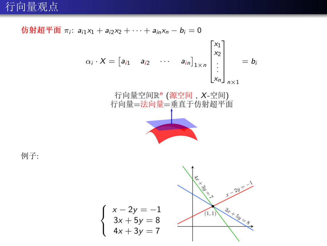 行向量的观点, 也称为源空间的观点, 它把线性方程组翻译成源空间(X-空间)中仿射超平面的相交问题, 它把线性方程组的每一个线性方程都理解成一个仿射超平面的方程. 我们在解析几何中学过仿射超平面的点法式方程, 因此很容易理解矩阵的行向量其实就是是仿射超平面的法向量. 行向量观点的主要收获就是行向量=法向量.