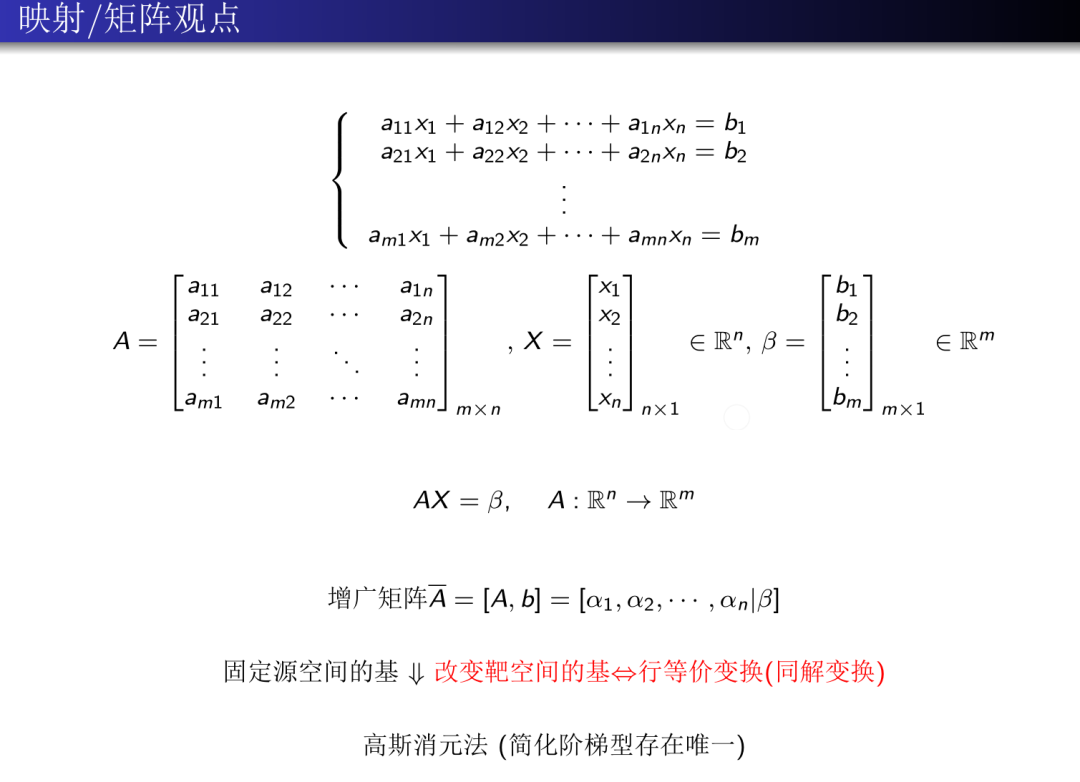 第三种线性映射的观点更简单,就是把矩阵 A 理解成线性映射 Y=AX. 从理解线性方程组的角度, 也可以把这种观点称为矩阵的观点, 它把线性方程组 AX=b 的信息全部抽象成增广矩阵的概念. 线性方程组的消元过程, 也就是对方程组进行同解变换过程, 就被理解成对增广矩阵进行行等价变换的过程. 可是从线性映射的观点看, 行等价变换的本质其实是改变靶空间的基的过程, 所以, 行等价变换就是靶空间的换基操作.