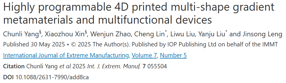 Yang C L, Xin X Z, Zhao W J, Lin C, Liu L W, Liu Y J, Leng J S. 2025. Highly programmable 4D printed multi-shape gradient metamaterials and multifunctional devices. Int. J. Extrem. Manuf. 7 055504.