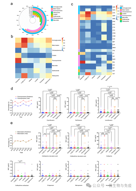 研究表明,沙门菌耐药谱在不同时期和血清型存在差异。总体上看,一线药物β内酰胺类和氟喹诺酮类抗生素耐药率较高,β内酰胺类和氟喹诺酮类耐药率随时间呈现上升趋势(图1)。在6种优势血清型中,肠炎沙门菌对氟喹诺酮类药物表现出高耐药率。