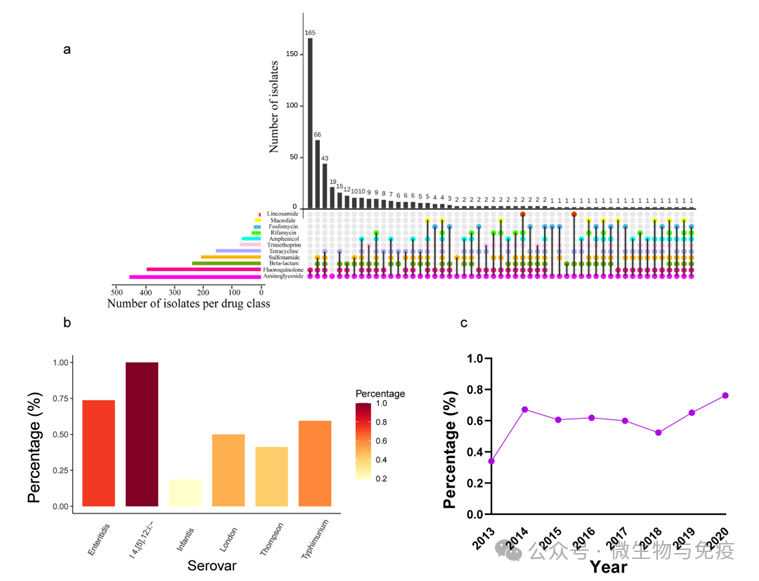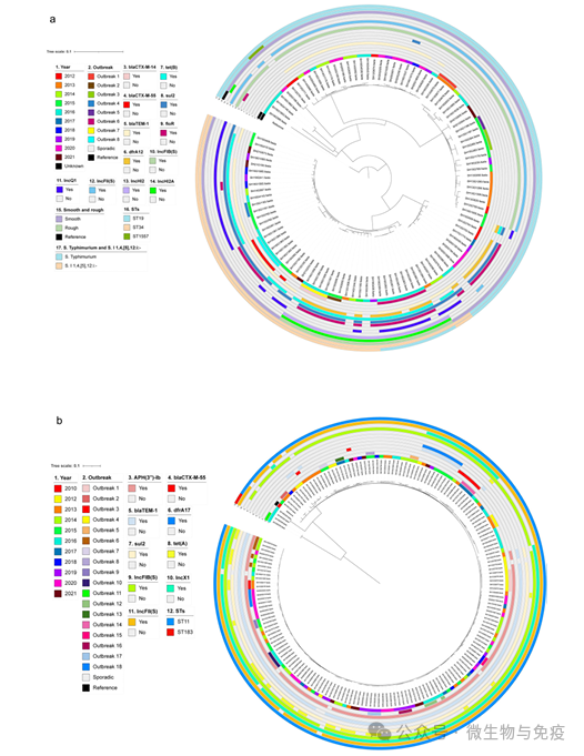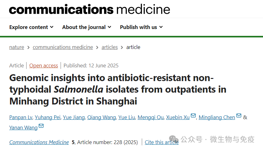 6月12日,河南农业大学王亚楠教授联合复旦大学附属闵行医院陈明亮教授、上海市疾病预防控制中心许学斌教授在Nature旗下期刊《Communications Medicine》(中国科学院2区 IF 5.4)发表题为“Genomic insights into antibiotic-resistant non-typhoidal Salmonella isolates from outpatients in Minhang District in Shanghai”的研究论文。该研究通过对2012至2021年收集的458株沙门菌进行耐药表型和基因组学分析,解析了闵行地区社区获得性感染沙门菌耐药和基因组特征,SNP分析提示疑似暴发事件中存在基因组关联证据,首次在暴发菌株中检测到鼠伤寒粗糙型新变体,且均携带三代头孢菌素耐药基因。