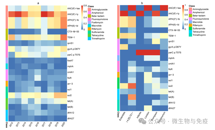 共检测到61种耐药基因,一些耐药基因呈现明显的变迁,如APH(3'')-Ib和APH(6)-Id、blaTEM-1、sul2、tet(A)和gyrA p.D87Y检出率呈现增加趋势(图3)。不同血清型中的耐药基因检出率存在差异,如blaCTX-M-55、sul2和tet(B)在鼠伤寒单相变种中更常见, qnrS1在汤卜逊沙门菌中更常见。
