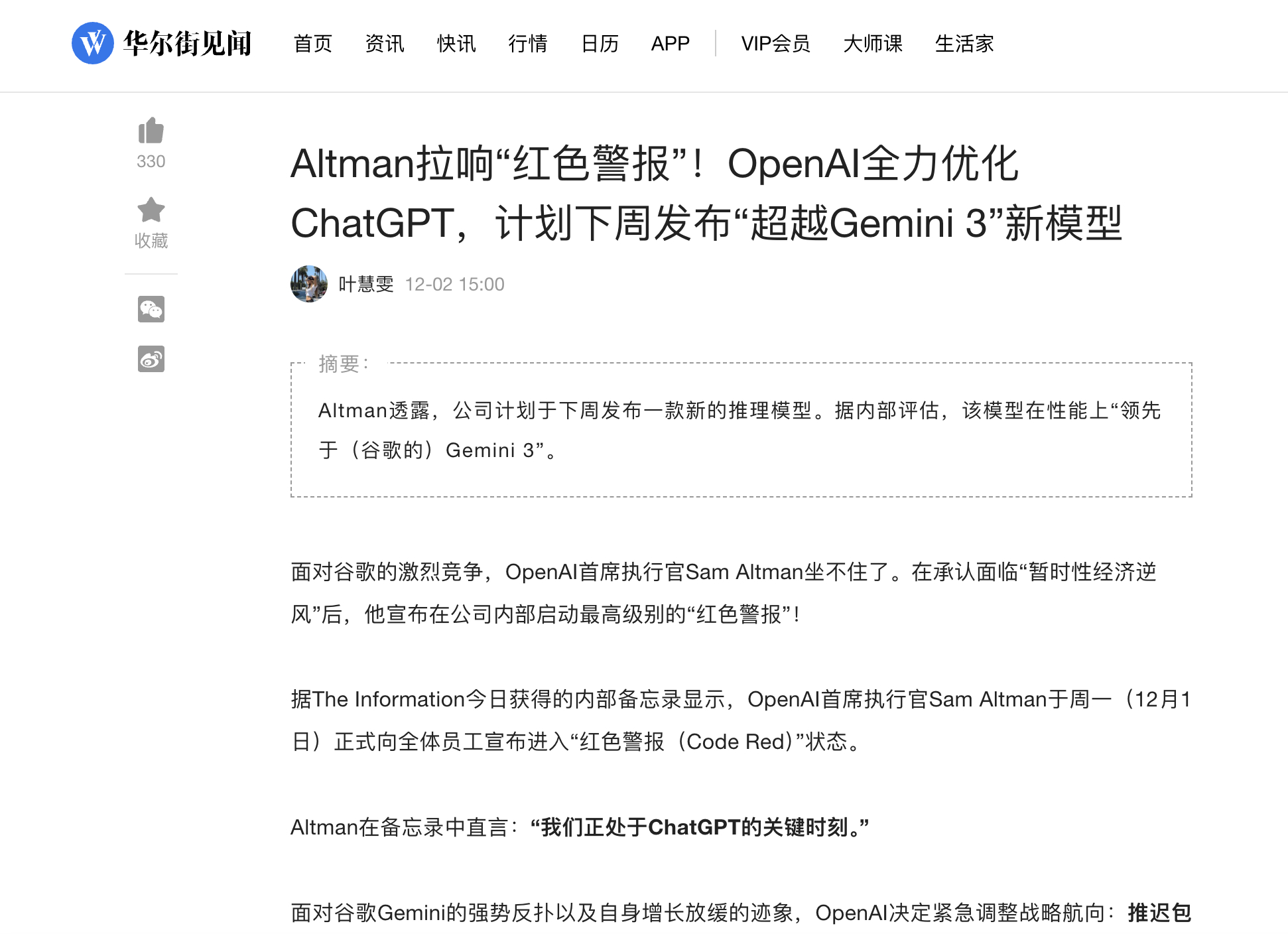 更有意思的是,就在 ChatGPT 发布三周年的时候,OpenAI 内部据说启动了「Code Red」—— 红色预警。为什么?因为竞争对手的进展太快,他们自己都感到了危机。