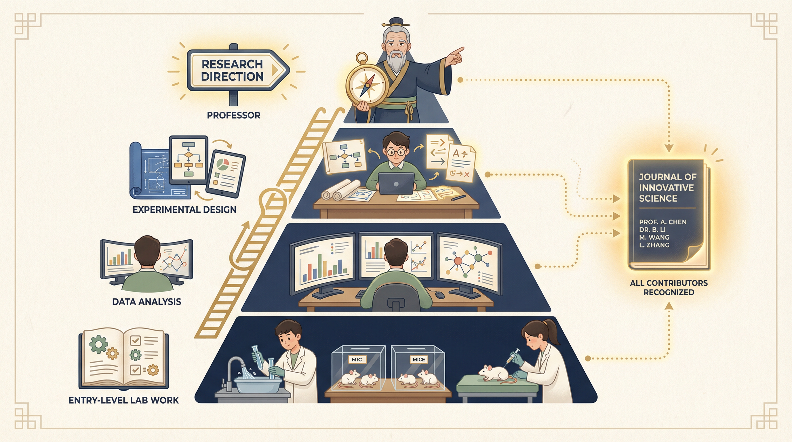 想想看,一篇科研论文是怎么诞生的?导师定方向,博士生设计实验,硕士生跑数据,本科生可能就是刷试管、喂小白鼠、给小白鼠打针。这些工作重复、机械、看起来毫无创造性可言。但没关系 —— 只要你按部就班完成了,整篇论文就能发表,你的名字就能出现在作者列表里。