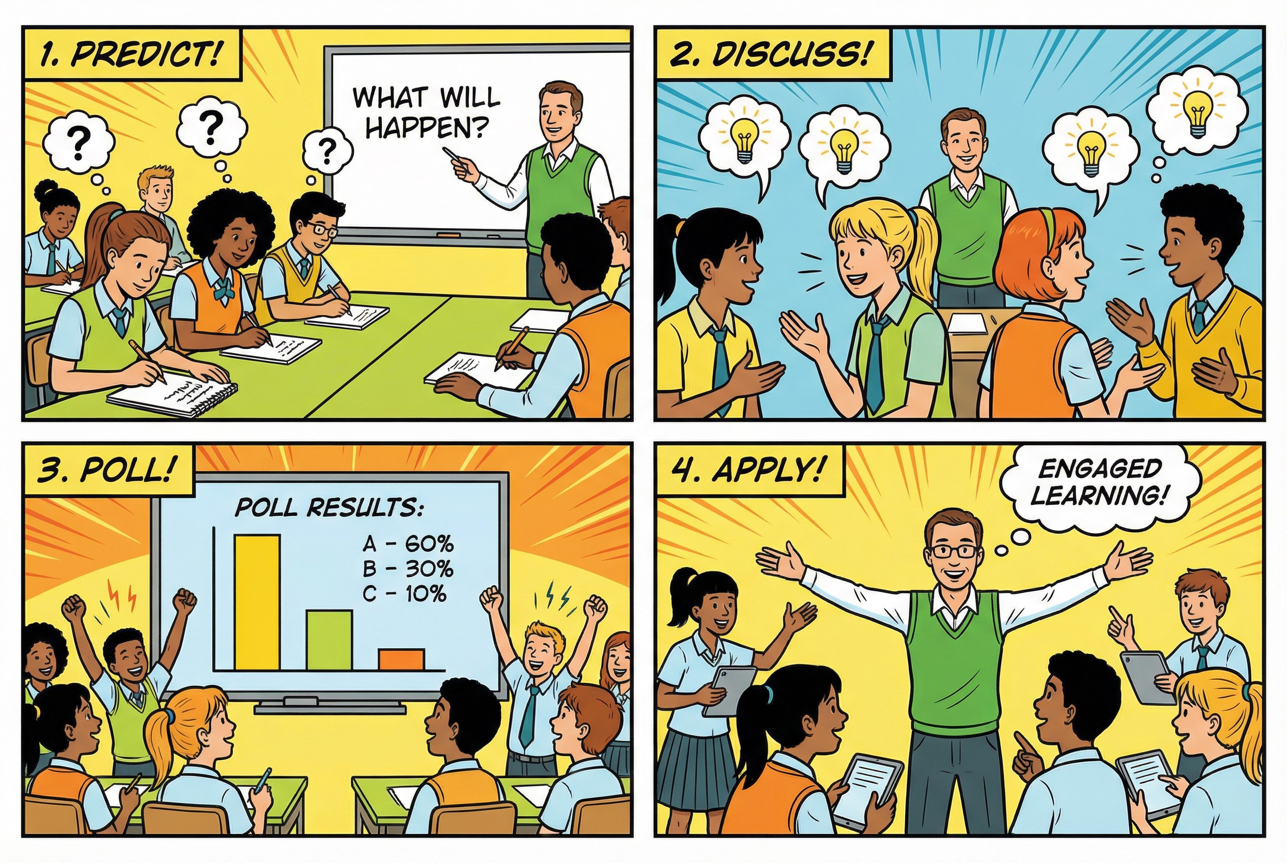 比如,最简单的 「预测—验证」 。在讲一个实验结果或一个公式推导之前,先停下来,让学生在纸上写下他们的预测:「你觉得接下来曲线会往哪边走?」或者「这一步参数变化会导致什么后果?」给他们 60 秒,必须写下来。只要笔一动,头自然就抬起来了。因为接下来的讲授不再是无关的噪音,而是验证他们预测正确与否的「答案揭晓时刻」。