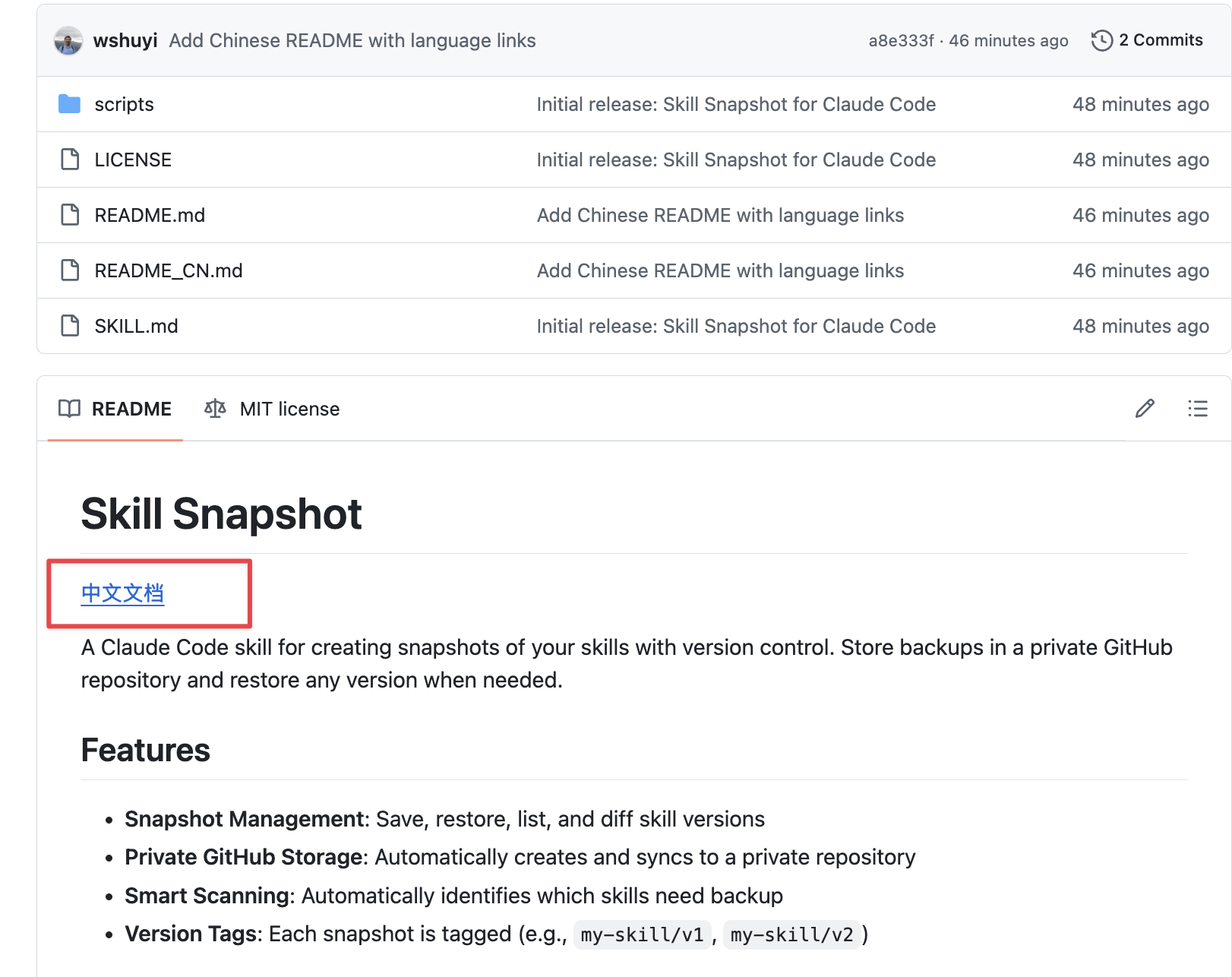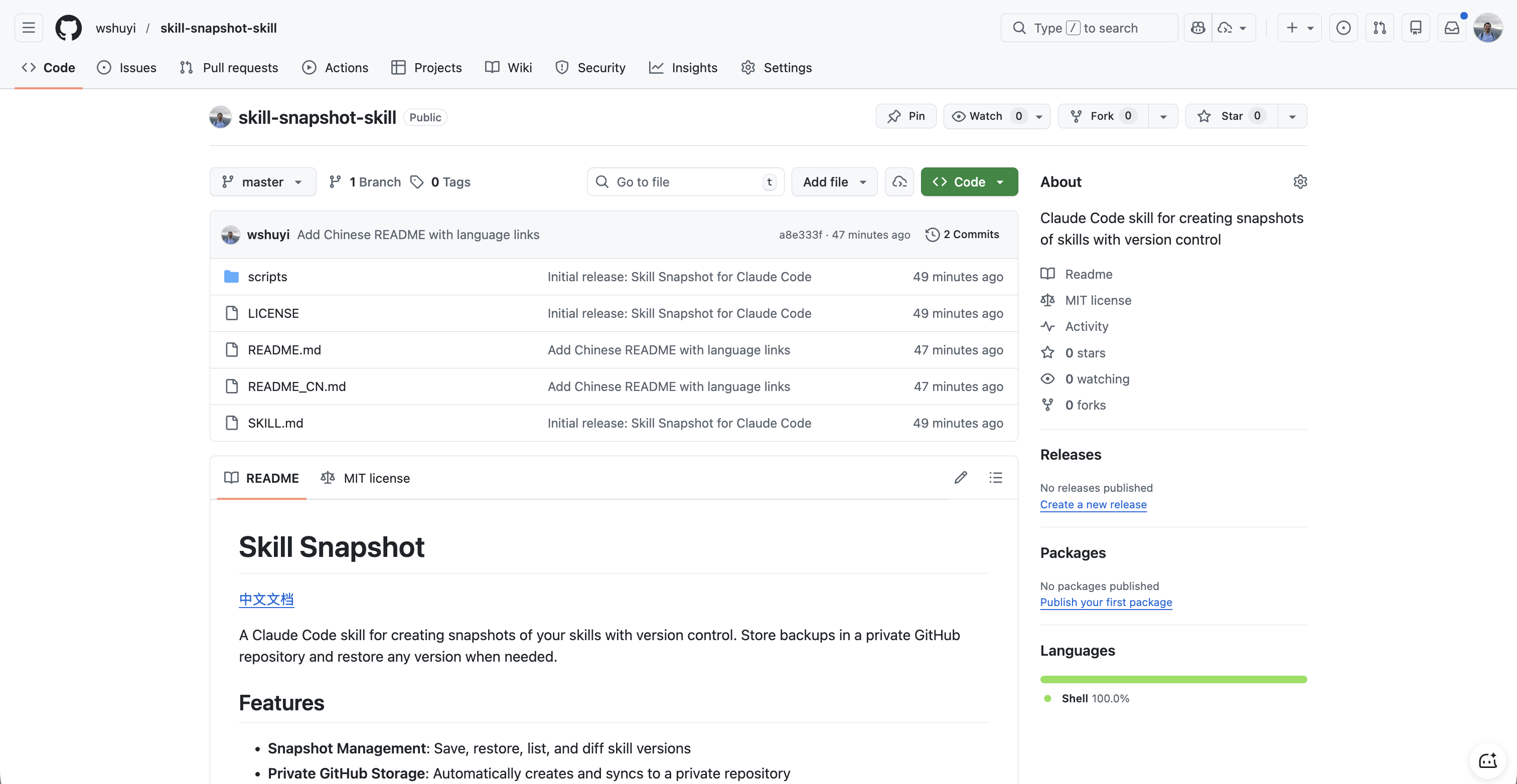 gh repo create skill-snapshot-skill --public --source=. --push发布完成。公开仓库地址:github.com/wshuyi/skill-snapshot-skill。你可以直接点击查看。
