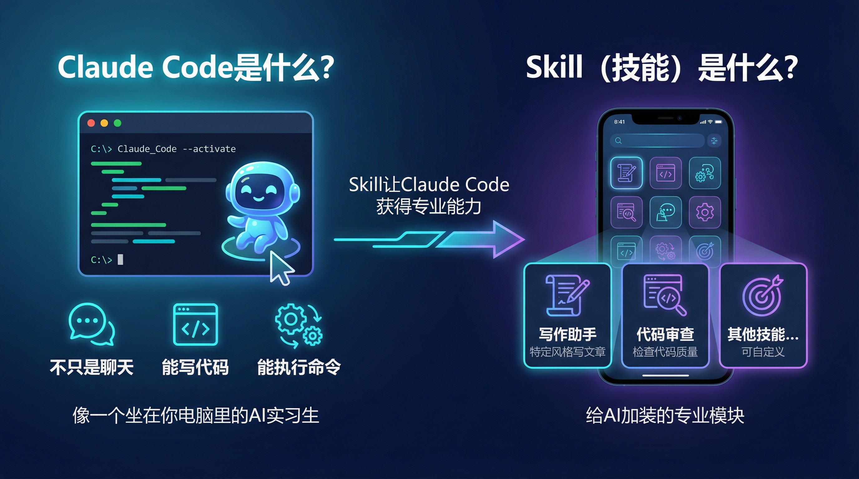 Skill(技能)又是什么?你可以把它理解为给 Claude Code 加装的「专业模块」。就像手机里的 App,每个 Skill 让 AI 学会一项新本领。比如,你可以创建一个「写作助手」技能,专门帮你按照特定风格写文章;或者创建一个「代码审查」技能,专门帮你检查代码质量。
