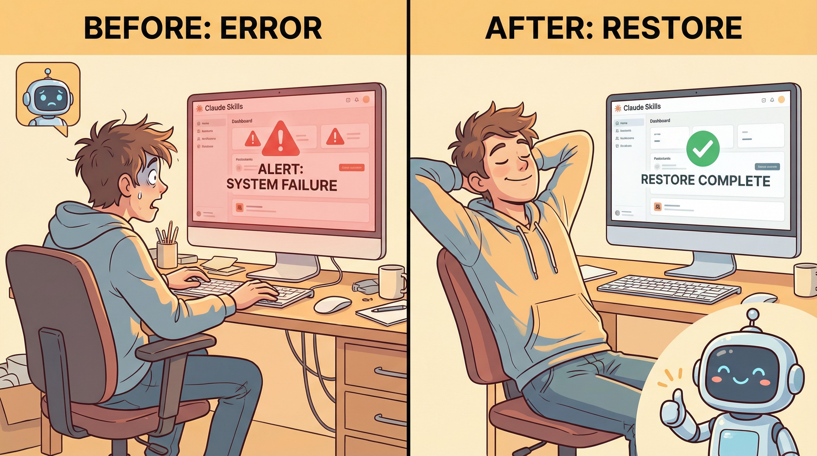 === 恢复快照 ===技能: my-skill版本: v1→ 当前版本已备份到: .snapshot-backup/my-skill-20260110✓ 已恢复到 my-skill/v1→ 技能位置: ~/.claude/skills/my-skill注意看第一行:「当前版本已备份到……」。工具在恢复之前,会先把你当前的版本(哪怕是改坏的版本)备份一份。为什么?万一你恢复后又后悔了呢?万一你发现「其实刚才改的那个版本有个地方是对的」呢?这份备份就是你的后路。