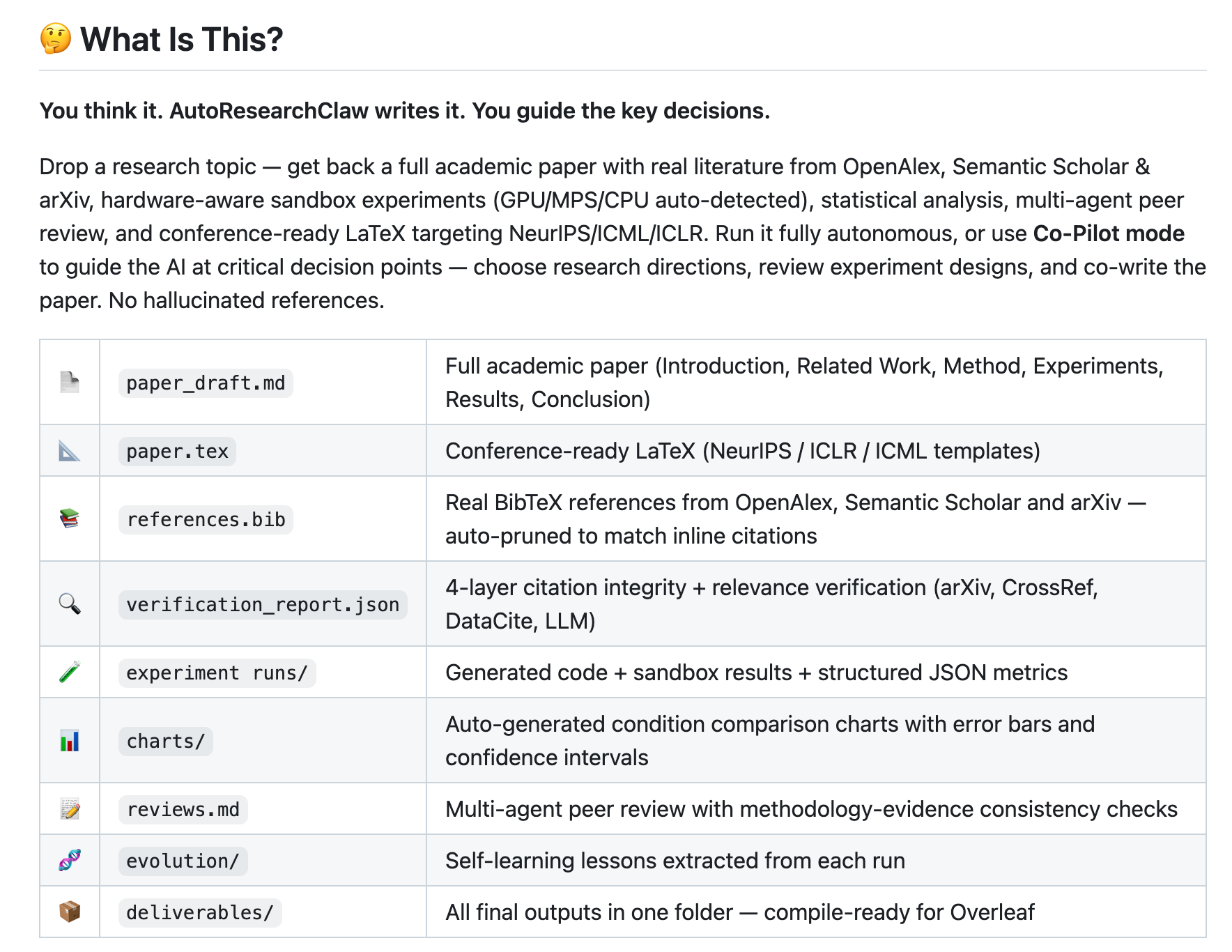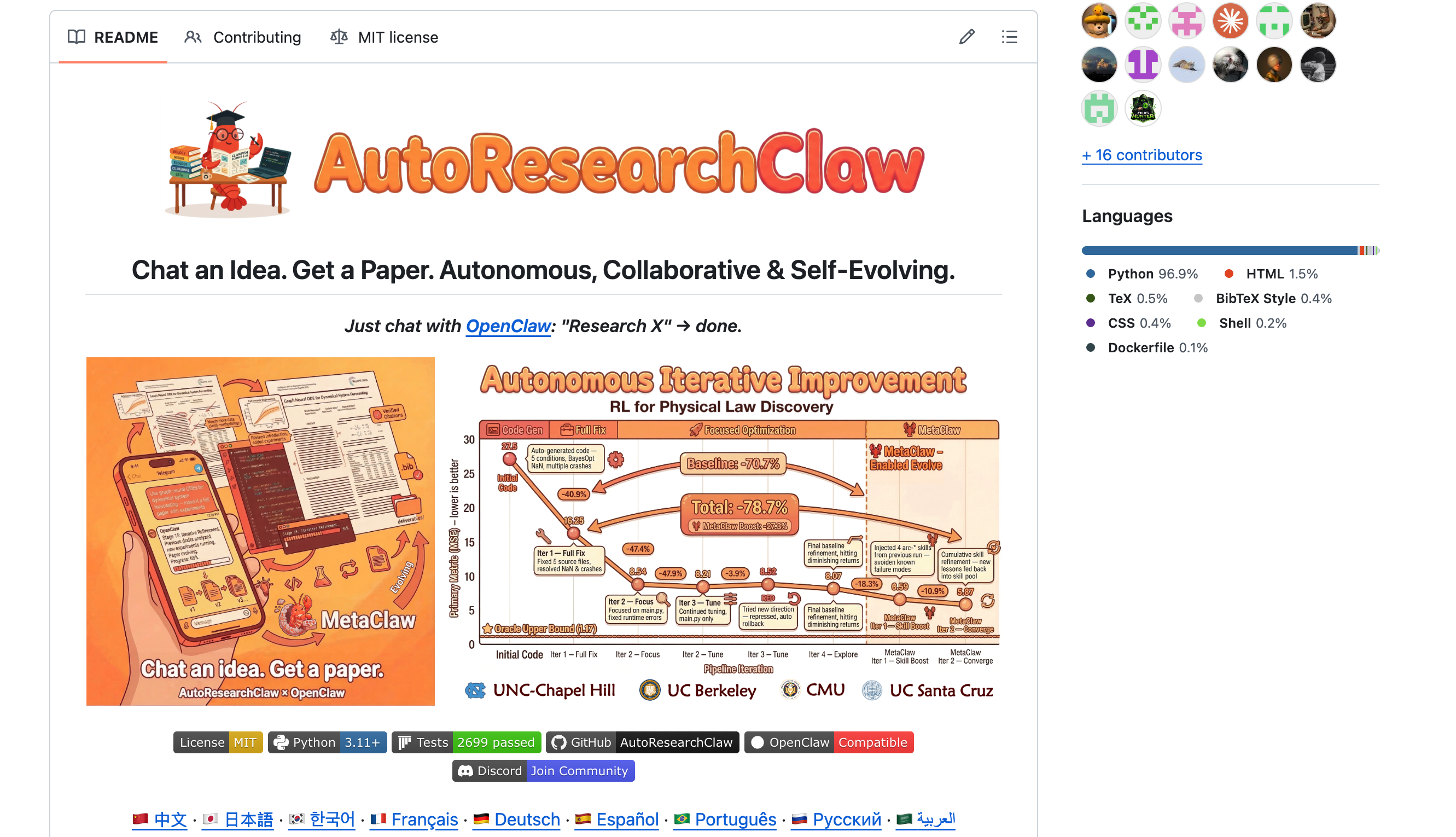 你输入一个研究主题,它通过 23 个阶段、8 个大步骤,自动完成:文献检索(对接 OpenAlex/Semantic Scholar/arXiv 真实论文库)→ 多 Agent 辩论生成假设 → 自动写实验代码并在沙箱里跑(能自动检测 GPU 类型、自动修 bug)→ 分析结果(不行就自动换方向重来)→ 按 NeurIPS/ICML 模板写论文 → 输出可编译的 LaTeX。