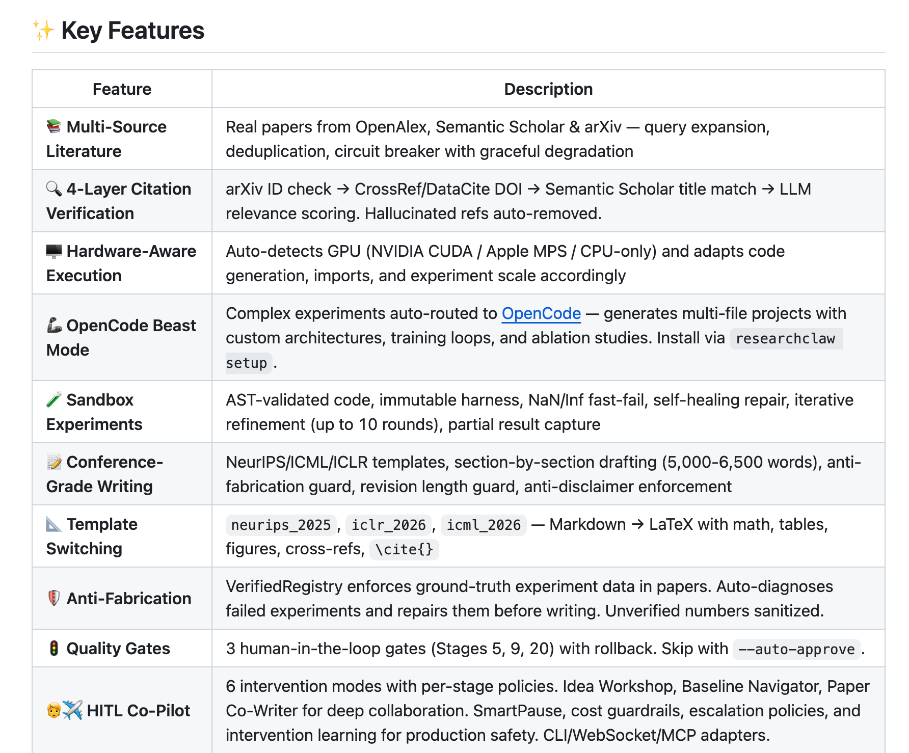 核心卖点是反造假:引用经过四层验证确保真实存在,实验数据有注册表追踪防止编造。支持全自动跑完,也可以在关键节点让人介入把关。