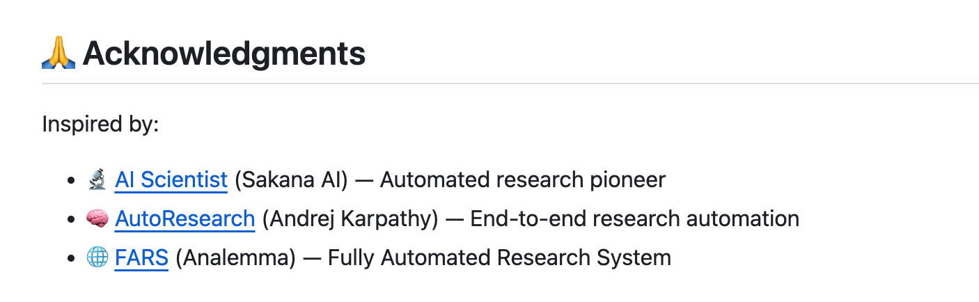 它是邓岳提到的 AutoResearchClaw 的灵感来源。