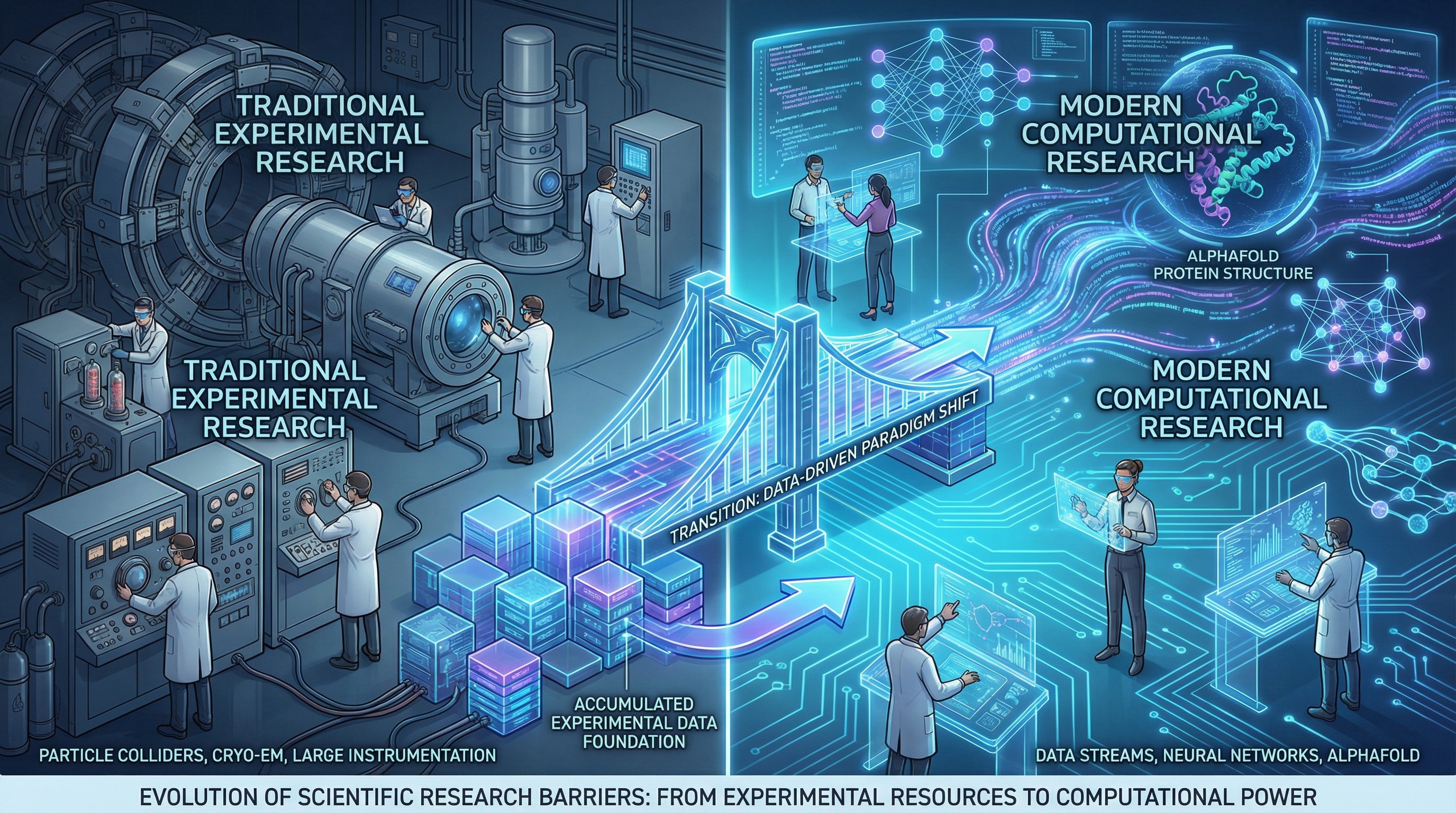 想想 AlphaFold。它把蛋白质结构预测从需要巨额经费和大型设备的缓慢探索,加速到了计算机可以在分钟级完成的程度。当然,AlphaFold 能做到这一点,离不开几十年实验积累出来的蛋白质结构数据库 —— 它不是凭空替代了科学共同体,而是站在了整个实验传统的肩膀上。但它展示了一种新的范式:门槛并没有消失,而是从实验资源转向了计算能力和开放数据 —— 而后者正在快速普及化。当计算能力足够充沛、探索可以自动迭代,原来那些需要逐一探测的笨拙路径就有可能被绕过。