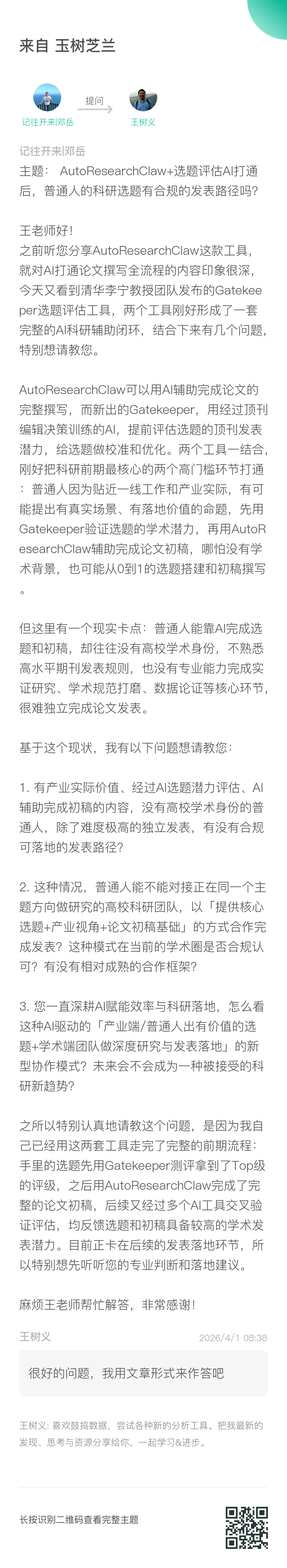 所以我对这种模式的判断是:会被接受,也会越来越重要。 但方向不是「普通人用 AI 独立发表」,更不是前面提到的「一人研究团队」——至少短期内不是。更可行的方向是:产业方带着问题和数据、AI 负责降本提速、学术团队负责研究设计和因果论证。三方各有分工,谁也替代不了谁。