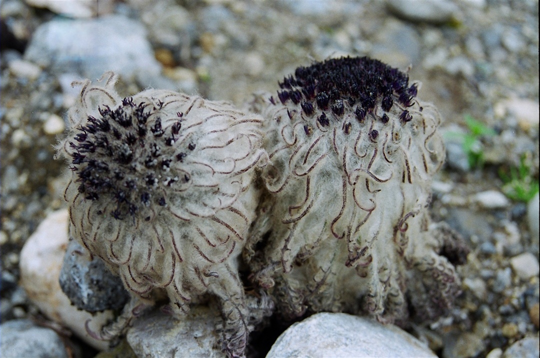 生长于青藏高原流石滩的水母雪兔子,白色绒毛包裹的植株紧贴砾石表面,紫蓝色花序在高海拔强紫外线环境中格外醒目(图片来源:中国科学院西北高原生物研究所)