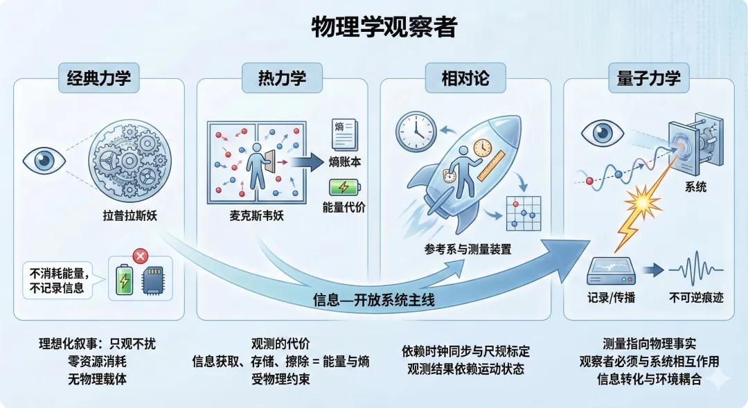 更重要的是,同一条“信息—开放系统”的主线也能把长期争议的“观察者”从不同物理范式中抽象出来。