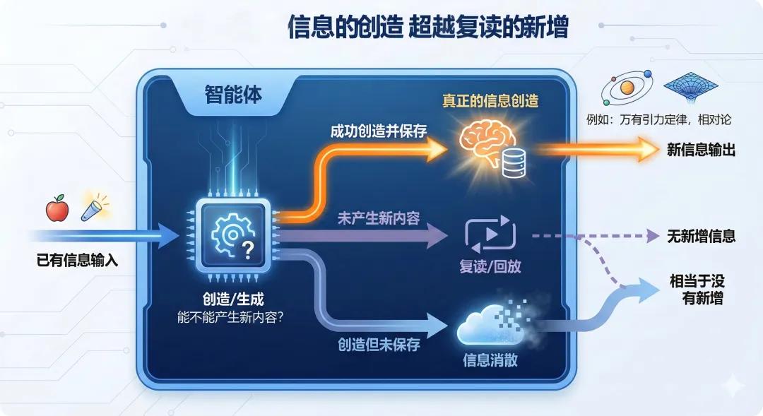 后者对应创造/生成(G):在已有信息基础上产生新内容,而不只是复读或回放。牛顿看到苹果落地,并没有止步于记住这个现象,而是创造性地提出:"如果地球吸引苹果,为什么月亮不落下来?",这个问题最终导向万有引力定律。爱因斯坦从光速不变这个已知事实出发,创造性地想象"如果我骑在光束上会看到什么",由此推导出相对论。这些理论在提出之前并不存在于任何书籍或数据中,它们是真正的"信息创造"。