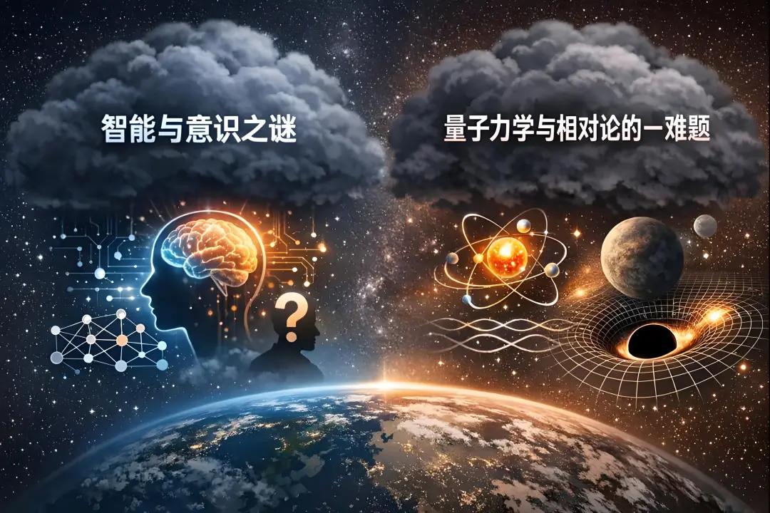 一个多世纪后的今天,21世纪的科学天空同样笼罩着两朵新的"乌云":一朵是智能与意识的本质问题,另一朵是量子力学与广义相对论的统一难题。