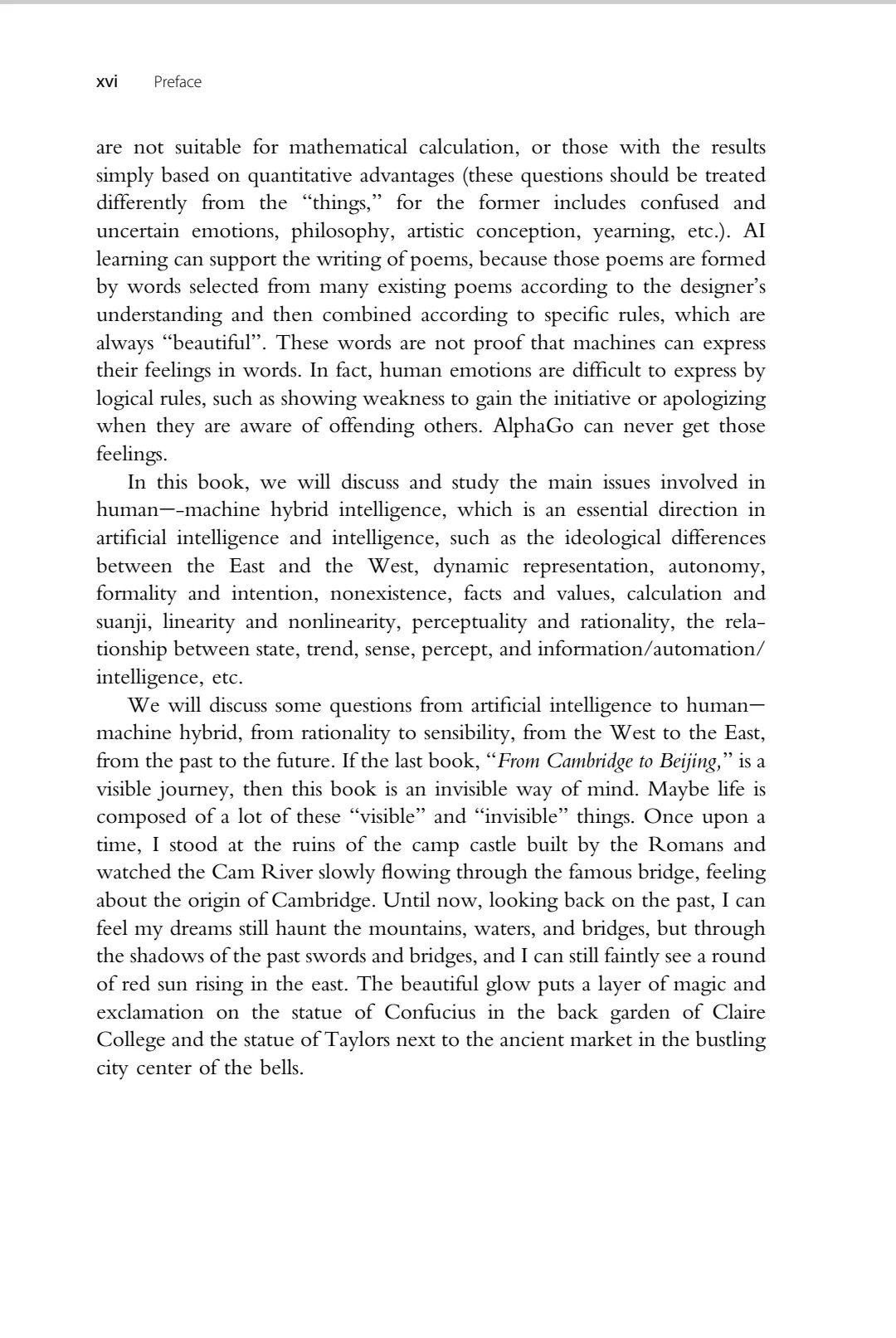 一直想写部有关人机交互方面的书,由于国内这方面的书比较少,国外的似不多,所以一直跃跃欲试,却总是言胜于行,久而久之,迟迟不能兑现,很是尴尬,更是有些狼狈!究其因,不外乎心不静、神不宁所致,最近终于等到了机会,来这里访学一年,“躲进小楼成一统,管他春夏与秋冬”。想法固然很好,可是真面对她时,就像一个在平原长大的孩子突然站在珠穆朗玛峰前或青春懵懂的少年首次独自面对心仪女生一样,不知该如何是好,该从哪里开始呢?左思右想,百思不得其解,正惆怅时,凌晨无聊打发时间,翻看莫言先生的杂文《超越故乡》,大概是讲何为小说及小说创作源泉的一篇文章,在文章的最后,他这样写道:“我们不可能另外去发现一种别的方法,唯一可做的是--学习马尔克斯--发现自己的精神支柱......故乡的经历、故乡的风景、故乡的传说,是任何一个作家都难以逃脱的梦境,但要将这梦境变成小说,必须赋予这梦境以思想,这思想水平的高低,决定了你将达到的高度,这里没有进步、落后之分,只有肤浅和深刻的区别。对故乡的超越首先是思想的超越,或者说是哲学的超越,这束哲学的灵光,不知将照耀到哪颗幸运的头颅上,我与我的同行们在一样努力地祈祷着、企盼着成为幸运的头颅。”对啊,人机交互,首先应该写人,而人是有故乡的,是可以如鹰一样翱翔的,而机现在是没有故乡的,不管怎样,在这里,我都真诚地希望它们在不远的将来能够尽快找到自己的故乡,进而和人类一起梦想着、超越着!