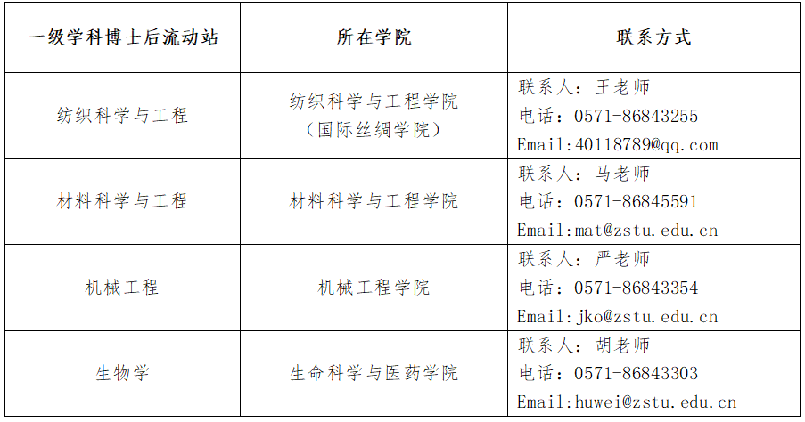 六、各博士后科研流动站联系人