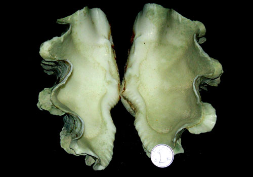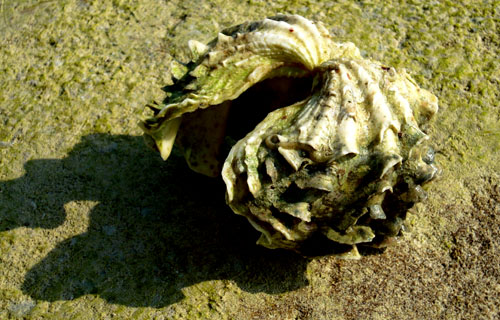以前,我只在三亚的沙滩上采集到砗磲的残片,很小,不足半个巴掌大,但每当看到这些大贝的遗骸,都有一种世事沧桑之感。而今,我可以坐在沙滩上,就像坐拥宝山一样,张着俩腿,把这些大贝壳都放在腿当里,细细挑选并品位每一件称心如意的标本。嗯,种类还真不少呢!别以为砗磲就叫砗磲,这贝壳上覆满鳞片的砗磲,叫鳞砗磲;这外壳曲起成弓状,表面有红色小斑点的,叫砗hao(字库里没这字,二声,左石右豪);这“身材”修长,后端有鳞而前端光秃,有5~6条肋的,叫长砗磲;当然,最大的大家伙,当然还是非大砗磲莫属啦!我一面鉴定,一面欣赏,不觉忘却了时间的存在。