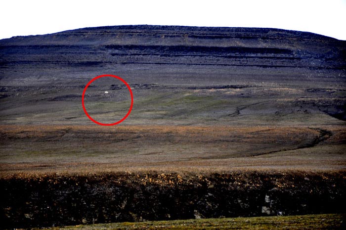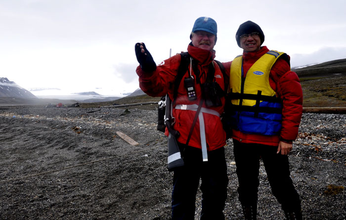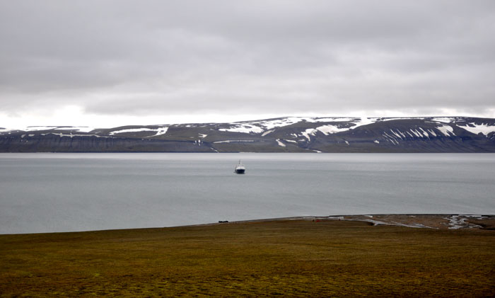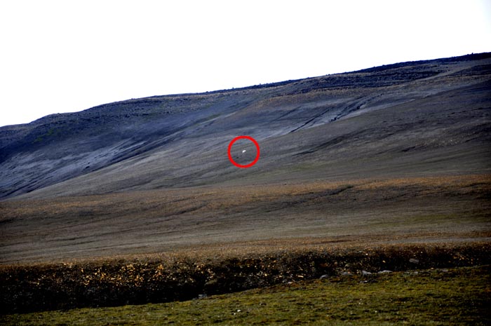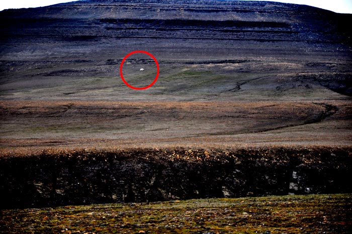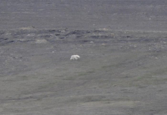 下到海拔200多米,距离岸边直线距离不到2000米的台地时,忽然向导又示意我们马上停下,就地待命!紧接着,“轰——”,又是一声闷响,向导又跟手台里的哥们儿询问了下面的情况。这回他明说了,“在山的那边,你们看不见的地方,发现了北极熊,其中一头是妈妈,就在下面的滩涂上,离我们的船很近;另一头,是儿子,大约三岁大,朝山上跑来了......”,好么,大家伙不是一头是两头,我们几十条壮劳力愣叫人娘儿俩给分割包围了,怪不得植物那帮人跟兔子似的兹溜儿一下跑了呢!怎么办呢?“山下的船员正在放枪,把它们朝别处儿赶,你们现在下山坐船正好在母熊的攻击范围之内,所以大家在这儿原地待命,等熊走了咱们再走”。