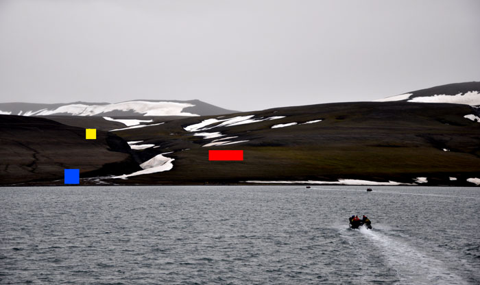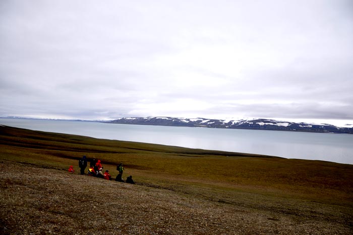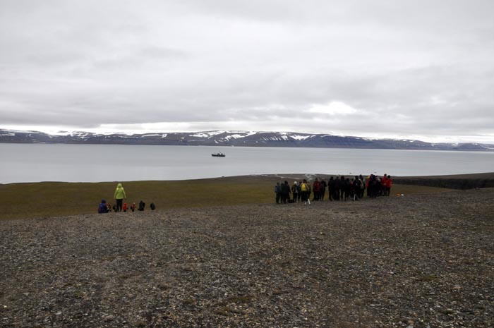 在北纬78度14分20秒,东经21度23分7秒(Rindedalen岛附近)这个无名高地上,大家都在兴冲冲地准备干自己的活计。我们的北极考察队这时在行进方向上出现了分歧,植物生态学那部分的弟兄们说要“拉样方”,得留在山坡下面数植物;地质和动物学的那帮子哥们儿说山底下什么都没有,得爬山。出野外,这种事情本来就不算什么,咱们考察船上的船员多,保镖多,枪也多,一个队伍留下一个保镖一杆枪,外围再多留一圈儿持枪的船员,了事儿!出发!!