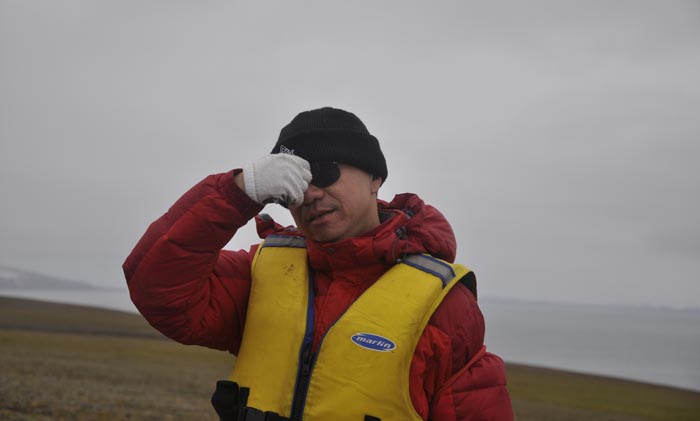 于是,地质队和动物队(怎么听着那么别扭呢?)就呼啦啦地朝山上走了。大家又是探冰川,又是找沉积岩,又是找鸟,又是找驯鹿和北极鹅的大便,正忙得不亦乐乎。忽然,有人面朝山下说了一句“哎,这刚几点呀?植物生态那帮人怎么坐船回去了?”,果然,山脚下的冲锋舟载着那几个哥们儿荡起一绺子水花儿朝着大船方向扬长而去。“这帮人,干这么会儿就累了,真没劲!”,有人正唠叨着,“轰——!”一声闷雷般的枪响,还带回音,这是船员使用的散弹猎枪发出的声音。“不对,有情况!”,这时,向导拿起了手台向山下呼叫,山下回话了,除了向导,我们谁也没听懂(挪威方言)。向导叫我们这帮人集合,向山下走。我们谁也没敢兹毛儿,乖乖儿地,一声不吭地跟着人家下山。其实,大家心里都猜到了——这一定是“大家伙”来了......
