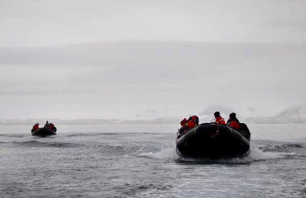 每天两次的考察登陆,让人精疲力尽!因为每次都得是如下一套把戏:穿羽绒服-穿救生衣-穿水靴-戴帽子-带手套-拿装备(除了带长焦的“大炮”以外,研究植物的还要拿铲子、标本夹、GPS和尺子;研究动物的拿网、采集袋、GPS和尺子;研究地质的拿锤子、岩石袋、GPS和尺子;我的兴趣方向是过了时的博物学,即动物+植物+矿物,所以,晕菜+昏厥——全拿!)-翻“我不在船上”的牌子-排队-跳帮(即上冲锋舟,要从船帮上船帮)......