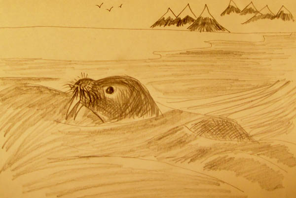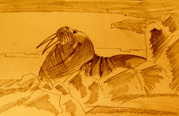 上船后,回到餐厅里,很暖和,为了与学生们讨论方便,在餐单儿的背面儿分别画了我脑海里想象的海象几十万年前的样子