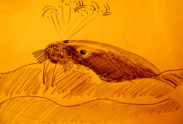 玩笑开过,现在,请允许我板起面孔,讲一讲我的一点见解吧。有可能别人不大注意,或者是我的孤陋寡闻,从C·乌斯宾斯基到G·卡林顿·雷,我从来没在任何文献和记录中看到过海象在游泳时喷水的记录来。粗粗看来,好像“这有什么大不了”的,不过是游水时的一个小动作罢了,但是,在我看来,这却非同寻常,我认为这是半陆生哺乳动物(除休息、产子和交配在陆地上完成外均生活在水中,例如海象、海豹、海狮,水獭从某种意义上讲,也算是向水中发展的一支)向全水生哺乳动物(除搁浅外,终生不上陆地,如鲸)进化的一个良好证据。鲸,是全水生哺乳动物的代表,它的进化特征之一是:鼻孔从头部的正前方向正上方发生了位移,原本鼻孔也是像海豹、水獭那样有一个突出的吻部,吻部的尖端是鼻,鼻孔的开口在鼻的正前方,后来为了游泳时呼吸方便,渐渐把鼻孔移到了头顶上,并把呼“气”这一表象演化为喷“汽”,在这一进化过程中,肯定存在过一些具有“中间过程特征”的动物物种,但可惜这些“中间动物”后来都灭绝了,只剩下它们改变了的后代——鲸而已。而我现在忽然惊喜地认为,海象在我眼前所呈现的这一幕,恰恰是半水生哺乳动物向全水生哺乳动物进化的一个例证。你看,与那些不存在喷汽行为的半水生哺乳动物——海豹(从来没有任何文献记录海豹有这一行为,并且在南北极的考察和航行途中,我曾经数十次观察游泳中的海豹,也不曾观察到这样的行为)相比,海象的鼻孔可比海豹鼻孔的位置高多了——海豹的鼻孔在眼睛的下方,而海象的鼻孔几乎与海豹的鼻孔相平行,并且开口斜向上方。这样的鼻孔已经具备像鲸鱼那样在游泳中进行“喷汽式”呼吸的资质了。在此,我自认为这是一个“很重要”的观察结果,如果接下来作进一步观察和研究的话,相信会有一些新发现,如果,海象的这一行为真的能够成为进化论又一个例证的话,那将是一件多么有趣儿的事情呀!(博物地理 段煦 文/摄影、手绘)
