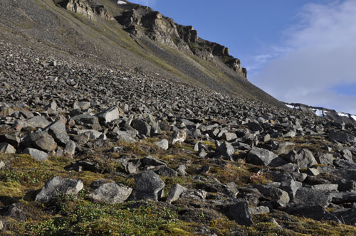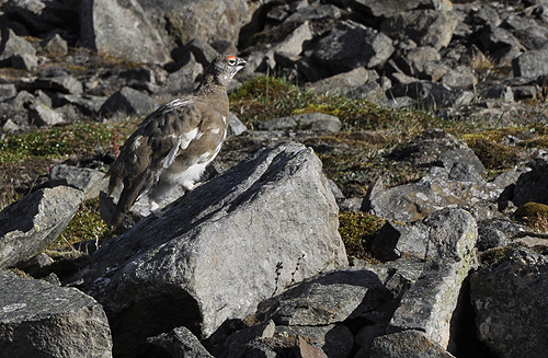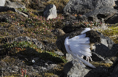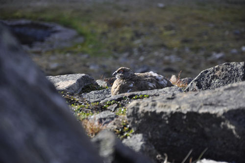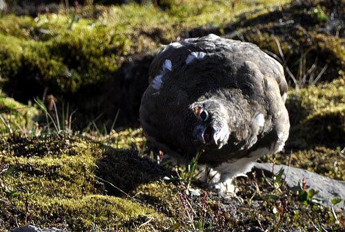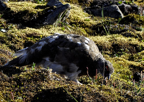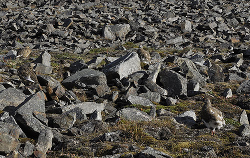 我眼前的松鸡,学名叫斯瓦尔巴德岩雷鸟,它们几乎是分布地域最靠北和最狭小(仅分布于该群岛)同时也是最珍稀的松鸡,能看到它们的身影,我感到无尽的,幸福。我决定先暂停我的植物研究工作,向这些肥胖的家伙们慢慢爬去。松鸡们在愉快而悠闲地信步觅食,我则搂着我的相机艰难地爬行,虽然苔原上的大部分地区覆盖着厚厚的苔藓,趴在上面比较松软,但,这些松鸡觅食的地方是一片被冰川剥蚀过的碎石坡,那些碎石的根基被冻土牢牢固定住,留下锐利的石头尖儿像匕首一样向上斜矗着。我就抓着这些石头尖儿作支点,向坡上爬着,但这些凸出来的石头尖儿每每地扎在肚子上不但难受而且容易把衣服剐成布条,幸亏我的衣服面料是一种结实的防雨帆布。7米、6米、5米,越来越近,所有家庭成员都在眼前了,有一只雄鸟领在前面,好的采食点往往是它先发现的,每每发现好吃的,便呼唤后面的两只雌鸟过来一同享用。雄性的夏羽上半身呈斑驳的熟褐色,下半身为白色,腿和脚面上居然覆盖着长长的羽毛(这是松鸡科动物的特征之一),最鲜艳的部分是裸露的眼睑皮肤,呈鲜红色;雌性全身都是熟褐色,杂以黑色的斑纹。如果它们趴在地上静止不动的话,这样的一身保护色很难被发现。