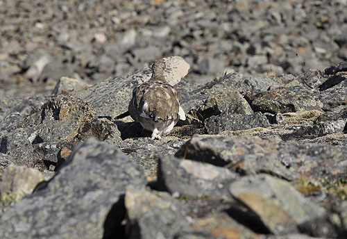 谁知,它们迁移到前方十几米的地方,又开始采食起来。原来,它们无非就是想和我保持一定的安全距离。于是,我又开始爬行,这回我向它们的斜上方爬去,因为我注意到,在它们身后不到3米远的地方,有一块巨大的冰川漂砾,我自认为可以躲在岩石后面拍摄,不被“哨兵”发现。不久,我爬到了巨石上方,四只鸟都被巨石挡住了,哈,我这回不在它们的视野之内,我站起身,蹑手蹑脚地走到巨石后面,趴好,然后从巨石的一侧露出半个脸和一个镜头——偷拍它们。呀,真好,它们还在低头觅食,这个距离真好,4米,能把它们的每一根羽毛都能照得非常清楚。得到了满意的照片,我又开始得寸进尺起来,我这次有意多露出半个身,让“哨兵”看到,却并不向前,只是打了个翻身,躺到了地上,我的直觉告诉我,它们并没有走,2分钟后,我又翻过身来,明目张胆地用照相机拍摄它们的倩影,相机快门发出一声声清脆的咔哒声,这样的距离还说它们没有发觉,似乎已经是掩耳盗铃了。于是,我就追随着它们的迁移取食的节奏慢慢爬行,每隔5分钟,与它们之间缩小1米的间隔,最终,我爬到了一只雌鸟的距离,而此时哨兵却没有发出警告,我目测了一下距离,2米。