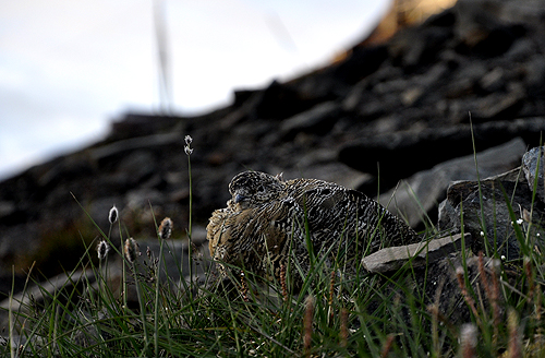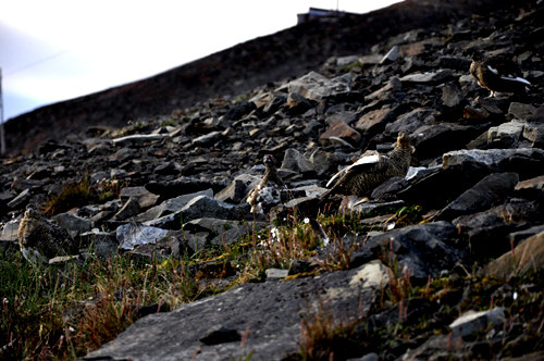 这天,我在夕阳的余晖下,与这群美丽大方的松鸡度过了一个美好的下午。晚餐时分,考察团以极其丰盛的晚餐招待了挪威著名大气物理学家,80多岁的Inns教授,他是高登义教授的朋友,曾经帮助我国科学家在北极建站,据说,他每年夏天都会在朗伊尔宾呆上一段时间。席间,我有礼貌地与大家畅谈,但脑子里却不由自主地想着山坡上的那群松鸡。终于,老Inns要离席回家去了,而冗长的晚宴马上就要变成聊天儿会的时候,我借着送老先生之名,从饭桌上撤了下来。把老先生送上车,我赶忙穿好衣服,背上相机向远处的山坡跑去。
