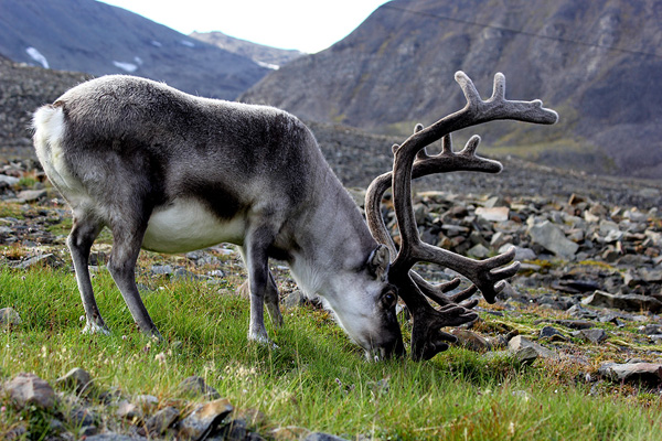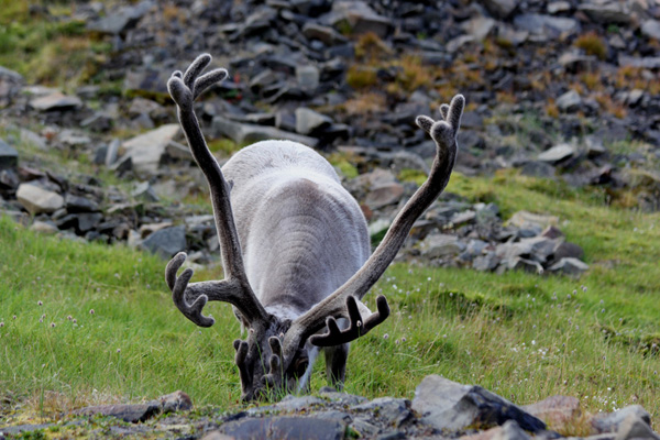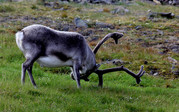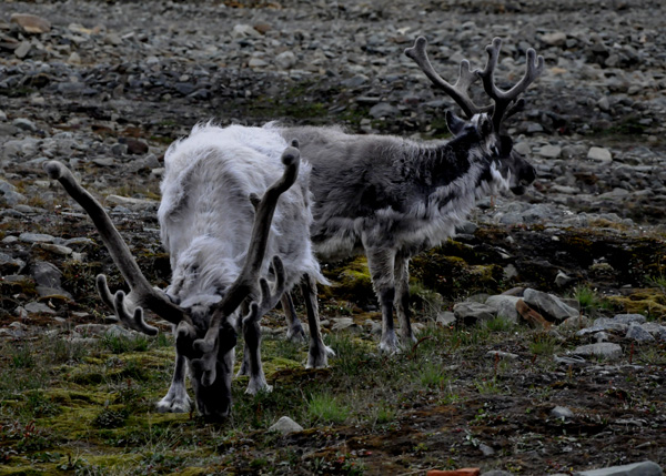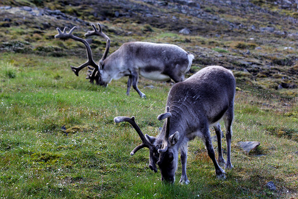 如果说,这一切都多少还可以让人接受的话。那么,转过一道山梁后,我就看到一幕我不能接受的事实了。我看到,远远的山坡上,有两个灰点在移动,我知道那意味着什么,屏住呼吸朝那个灰点慢慢接近,我兜着圈子迎着风向绕到那两个灰点的跟前,我满心欢喜地认为,去年那两个穿着“破老羊皮袄”的斯瓦尔巴德驯鹿夫妇(因为现在是驯鹿正准备褪掉冬毛换上夏毛的时节,冬毛在掉,夏毛在长,显得浑身破烂),结果令我既惊喜又出乎意料。惊喜的是:没错,是斯瓦尔巴德驯鹿,很可能就是去年遇见的那对儿(大型动物一般都有固定的领地,它们的家域观念十分强,而这个山谷就这么小,去年我曾以这条山谷作样线,一路走下来,只发现这一对驯鹿和远处一只孤鹿的身影)。出乎意料的是,那身破烂的“老羊皮袄”不见了,取而代之的是一身美丽的,栽绒毯子一样的夏毛。哦!!这也太快了吧?!这才相隔5天啊,我去年也是到达的第二天(7月21日)见到它们的,而5天的时间,是绝不可能把一身厚重的老羊皮袄换得如此干净利索!是夏天提前了?还是换毛加速了?